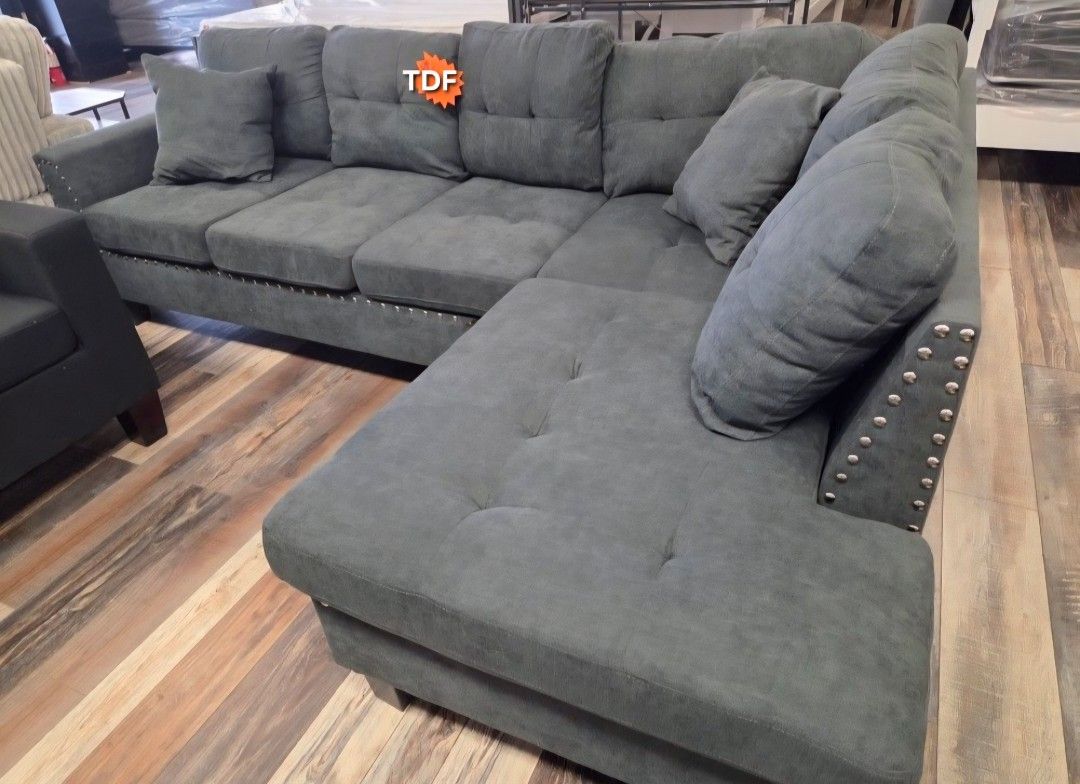 Brand new Ash black color tweed Velvet Like Sectional Sofa with 2 accent pillows. Comes new in 2 boxes. Assembly required. Right facing chaise. 98x67x35h. Nail head accent trim. Also available in or brown or charcoal Linen. Delivery π for additional fee. Firm price Couch Sofa. L shape. Sectional Fabric linen Velvet tweed Brown Grey charcoal tan beige Delivery
