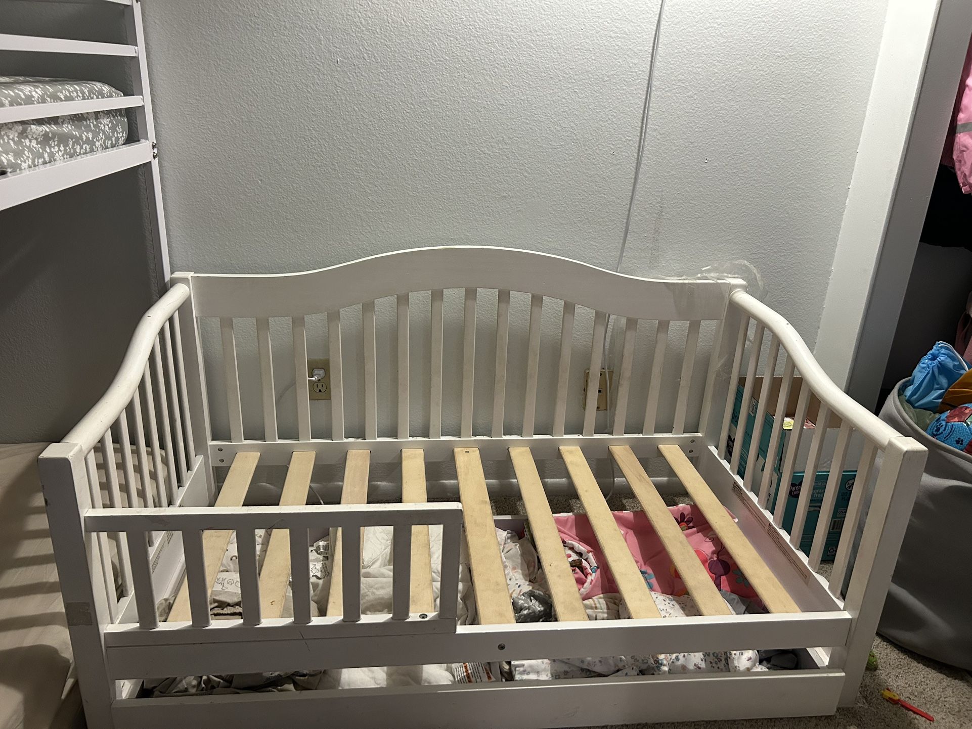 Free Toddler bed. In okay shape, good enough for our little ones to have used. We got toddler bunk beds so no longer have use for this. The bottom compartment comes out of the track at times, so we just used it by sliding it on the floor. (Bedding not included). The bed will not be taken apart for pick up.