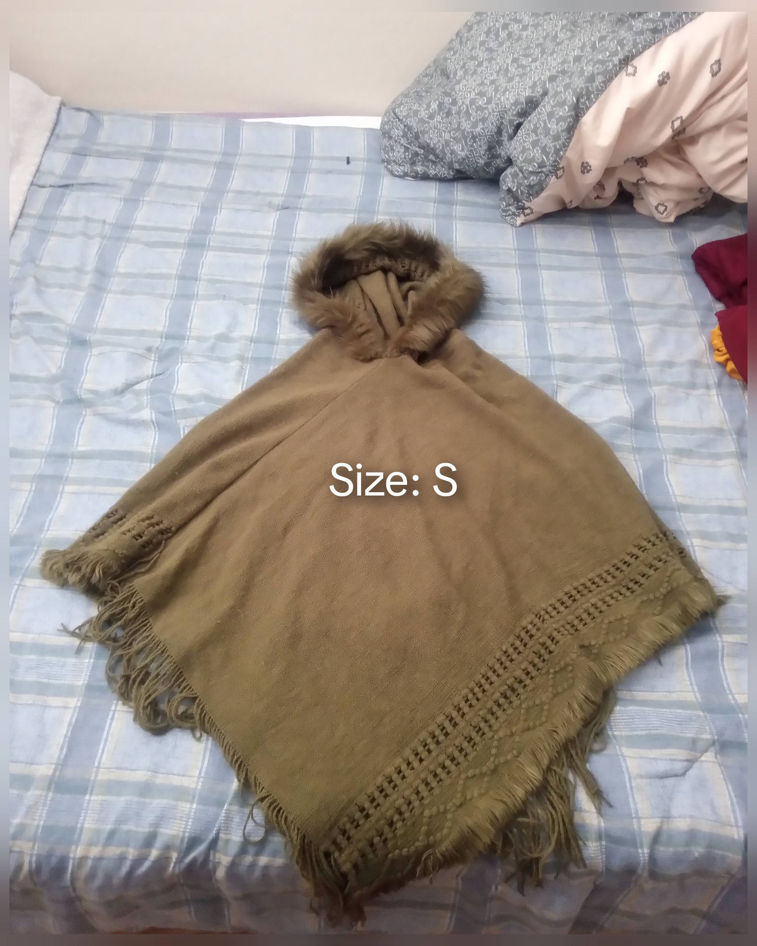 Brown Poncho With Fringe And Hood Size: S
