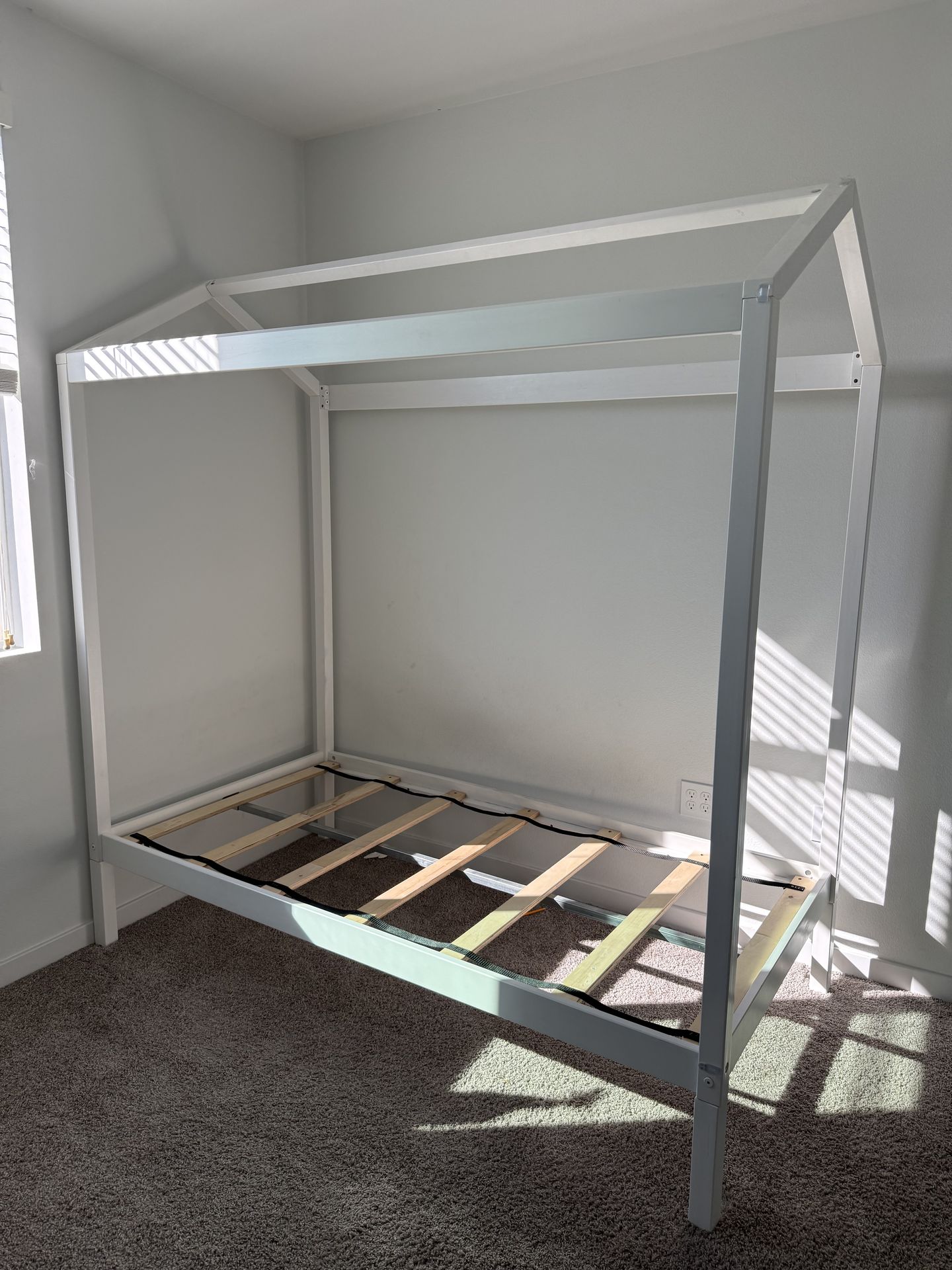 Selling a white twin sized house bed/canopy bed. In good, used condition. It’s super cute when put together! I tried to show little issues in the pics, but just know it has its fair share of little nicks and booboos. Could probably be touched up with paint. It’s taken apart right now, but I have all the screws and the instruction manual on how to put it back together. Does NOT come with a mattress. Must be able to move and transport yourself. Cash only. Exact change please!