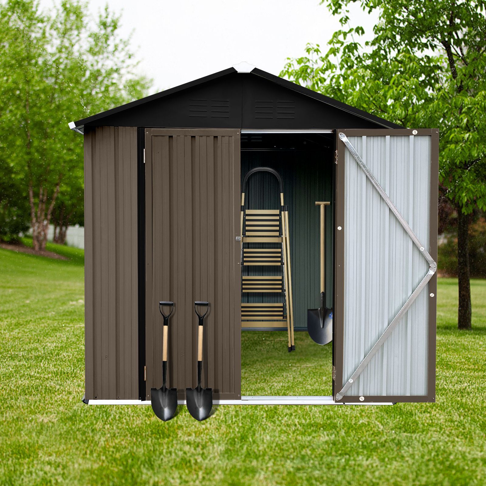 Out storage sheds 6ft×4ft Apex roof Brown + Black Length (in.): 66.02 Width (in.): 23.62 Height (in.): 5.71 Weight (lbs.): 99.23 The detailed instructions make it easy to complete the installation step by step. Unlike typical sheds with plastic vents, this shed comes with two integrated punched vents which will not deteriorate against sunlight. A hinged door offers more customization opportunities than a sliding door does. A heavy-duty complimentary padlock grants extra safety. Apex roof sheds have the apex gable ends and are the most popular and economical type of metal shed design. W1350P288800