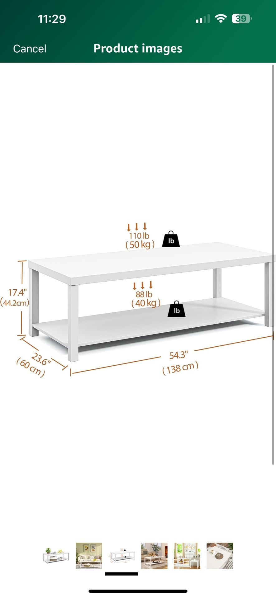 Brand new, never opened, never used. Brand furtble Product Dimensions 23.6"D x 54.3"W x 17.4"H Item Weight 23.49 Pounds Maximum Weight Recommendation 110 Pounds Frame Material Engineered Wood Color White 【2-Tier Coffee Table】With its open design, this coffee table features two spacious tiers, provide convenient storage space, keeping your essentials organized and easily accessible. The installation position of the bottom shelf is up to you, recommended is 10cm/3.93inch from the ground. 【Minimalist Furniture】The modern two-tier wooden coffee table matches well with any style of furniture and decor in your home. Simple clean lines appearance design exudes rustic charm and highlights your modern and elegant taste. 【Sturdy & Stable Table】Crafted from reliable engineered wood, our farmhouse rectangular table is built to withstand daily use, the robust structure ensuring long-lasting reliability, the smooth surface of this table is easy to clean, water-proof and scratch-resistant. 【Shop with Confidence】Our clearly labeled parts and step-by-step instructions make assembly quick and easy (an extra helper is recommended for best results). Your order ships in heavy-duty boxes with premium protective foam to ensure safe delivery. Should you receive any damaged items or encounter questions during assembly, our professional support team is always ready to provide expert assistance and ensure your satisfaction. 【Perfect for Any Room】Dimension is 54.3"L x 23.6"W x 17.40"H, whether you're styling a modern apartment, a cozy home, or an office lounge, this coffee table fits perfectly in various settings. Ideal for small spaces, it maximizes functionality without sacrificing style. White 2-Tier Coffee Table for Living Room, Modern Rectangular Center Table with Storage Shelf, Easy Assembly, Accent Table for Office Reception Room, 54.3 x 23.6 x 17.4 Inches