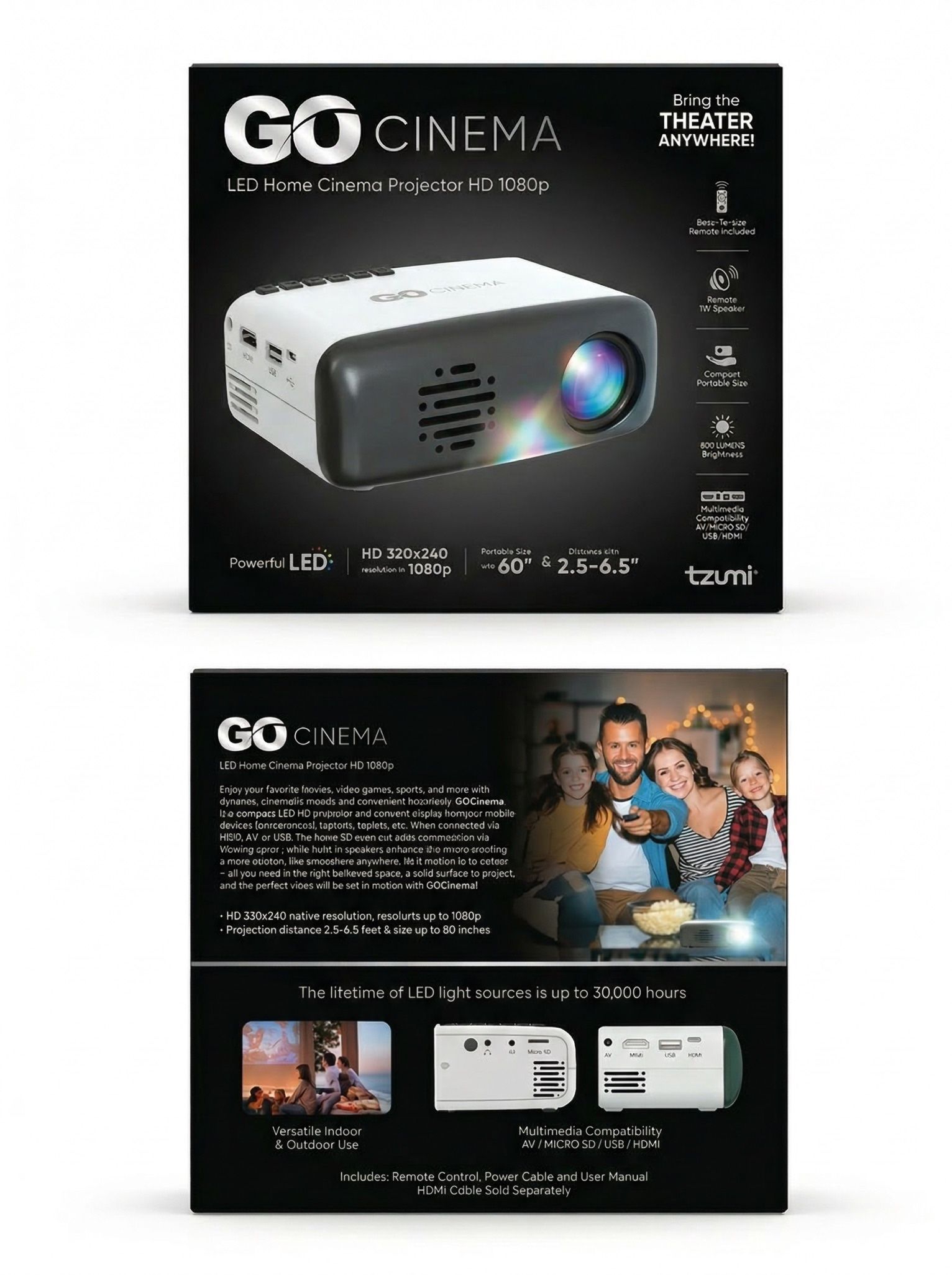 Tzumi GO Cinema LED Mini Projector HD 1080p Portable Home Theater HDMI USB w/ Remote