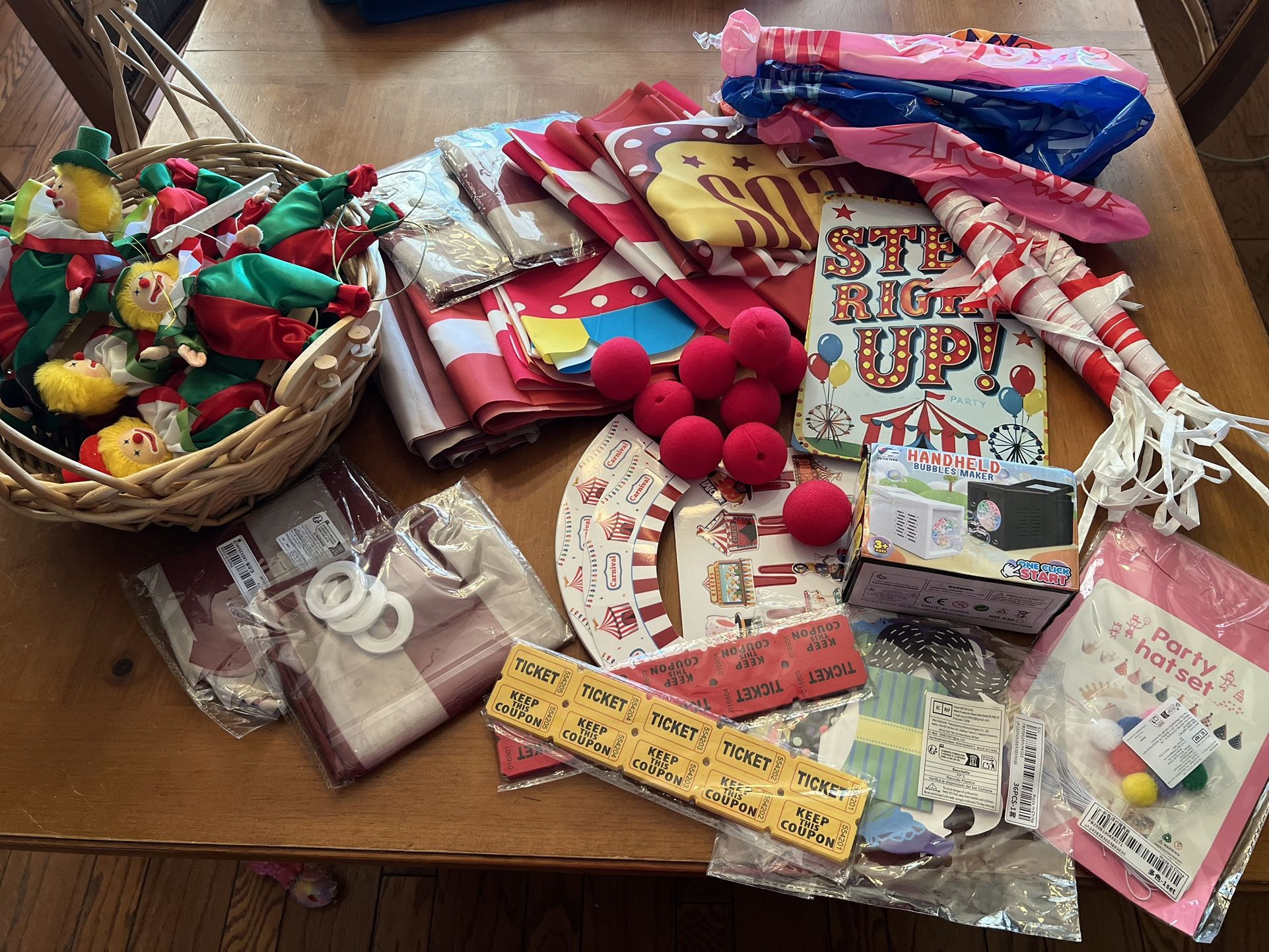 🤝🏼MAKE BEST OFFER Includes decorations: 2 reams of tickets, 15 hanging banners/borders, 10 clown noses, party hat set, “Step right up” metal sign, 4 inflatable “pow” bats, package of Photo Booth props and a handheld bubble maker. $40 75th Ave and Union Hills Can also meet at 32nd St & Beardsley