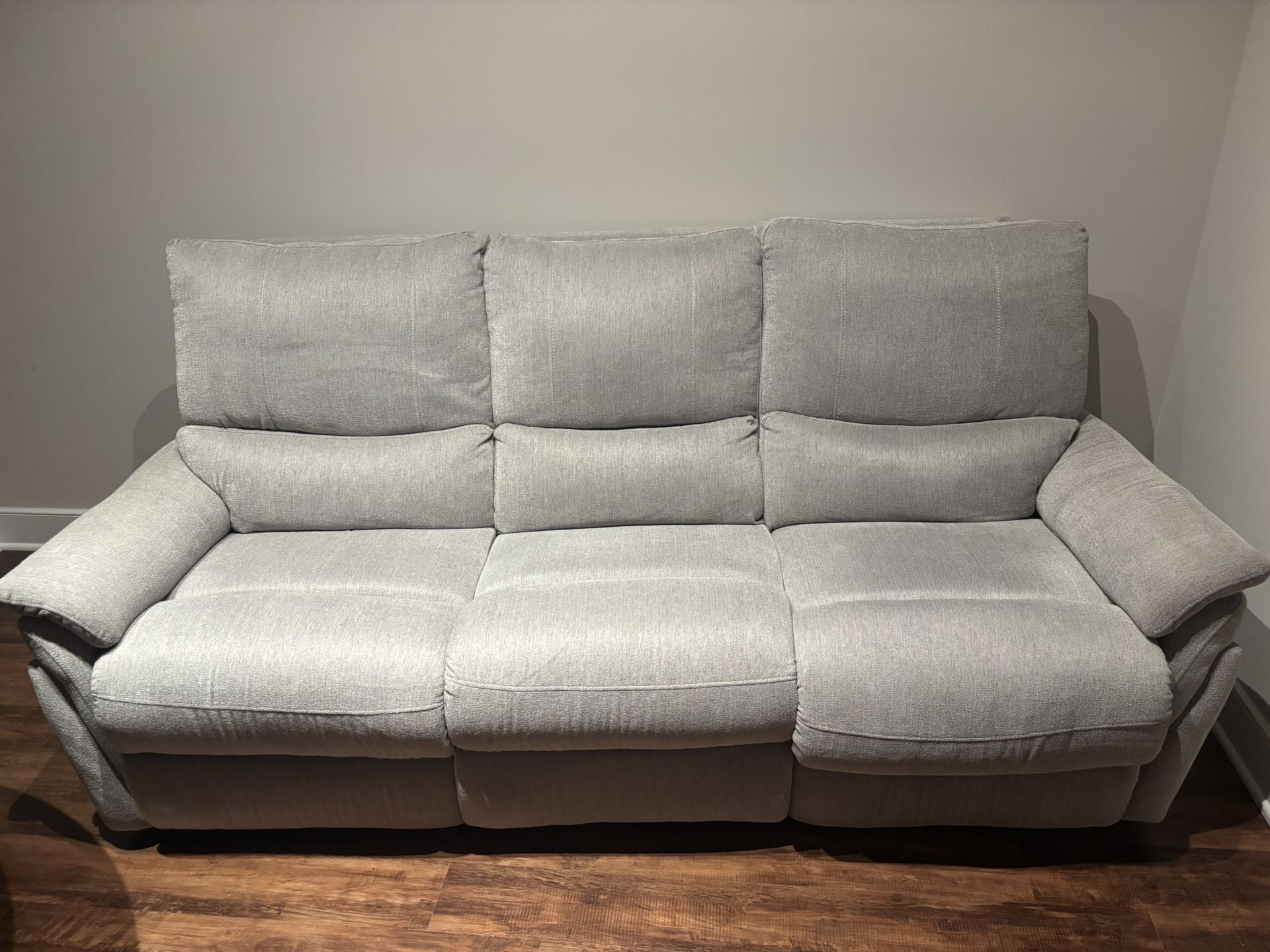 Comfortable couch with recliners on both ends. Both sides recline smoothly and independently. Light gray fabric, couch is in great condition with no wear and tear.
