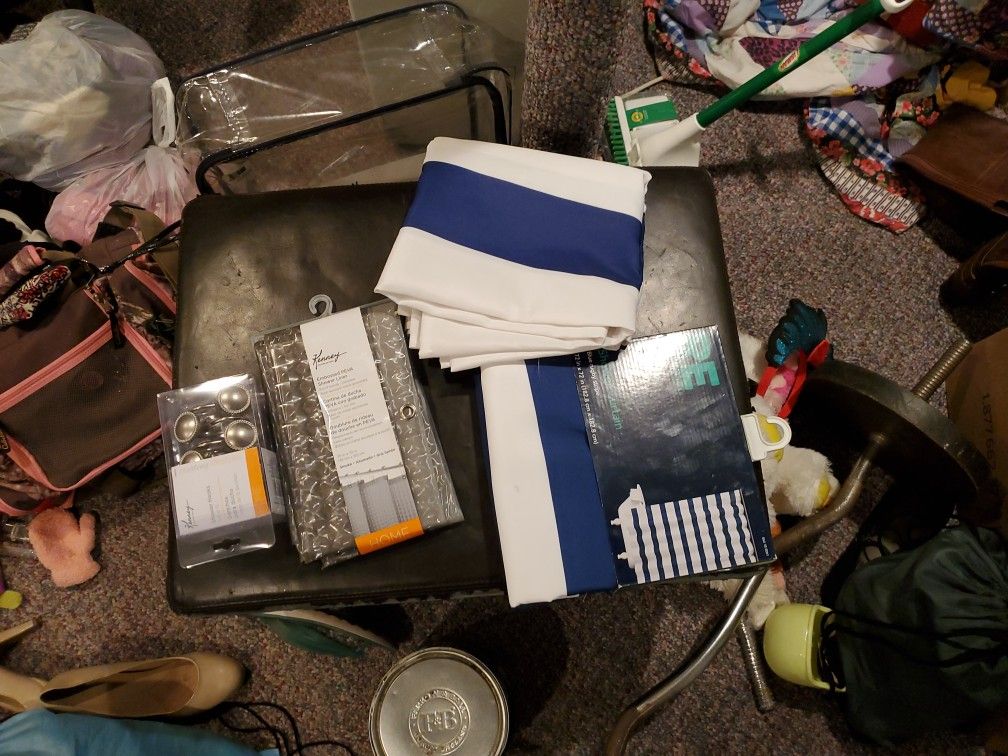 One shower curtain is used, and the other is brand new. Shower curtain hooks, and heavy duty shower curtain liner.