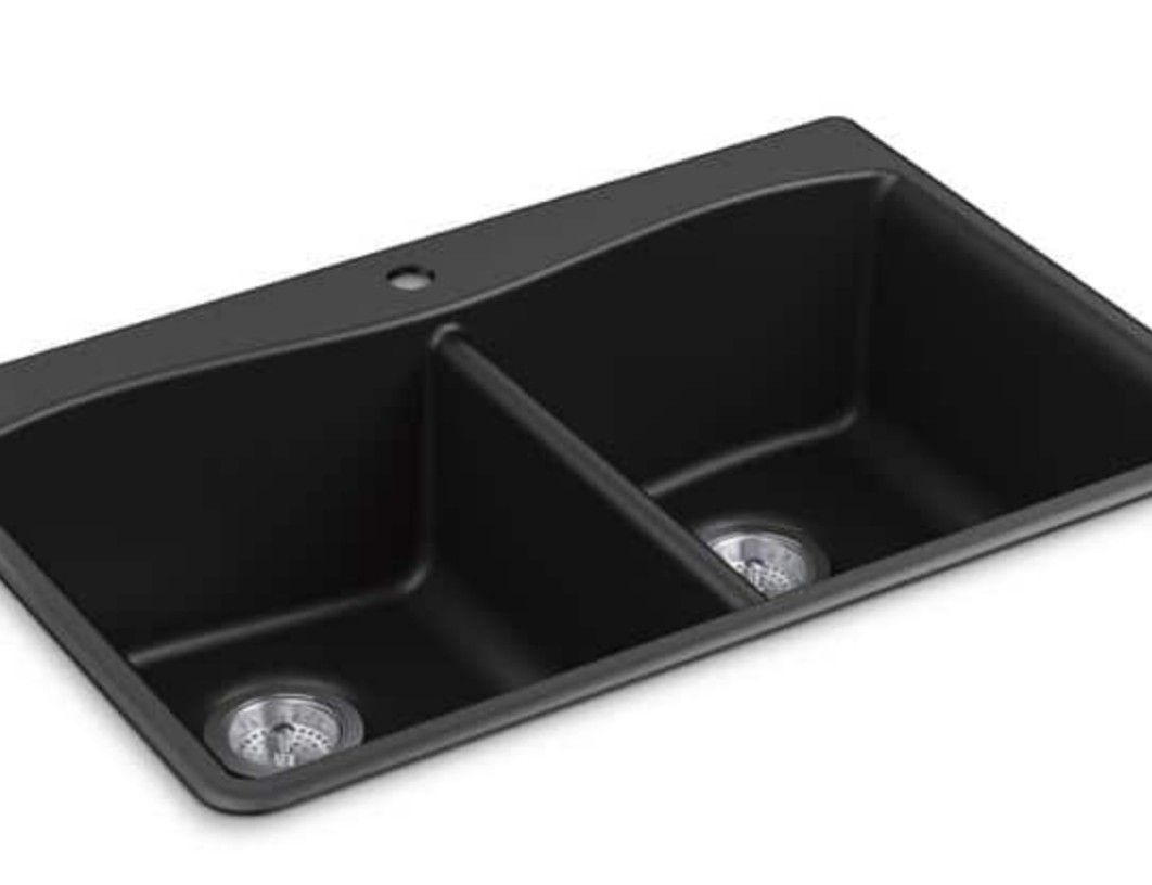 Kohler Kennon Dual Mount Neoroc Granite Composite 33 in. 1-Hole Double Bowl Kitchen Sink in Matte Black . 33 in x 22 in x 9-5/8 in 36 in. minimum cabinet base width Neoroc is scratch, stain, chip, and thermal-shock resistant