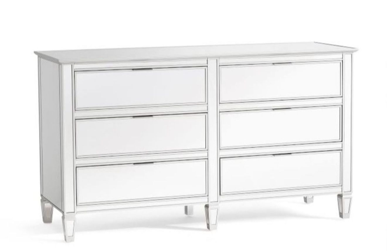 Dresser dimensions - 40" w x 21" d x 35" h - Top, sides and drawer fronts are mirror over hardwood and MDF, an engineered wood that lends exceptional strength and ensures the table’s structural integrity over time. - Drawer sides are made from hardwood and MDF; drawer bottoms are MDF. - The frame is constructed of kiln-dried solid hardwood. Kiln-dried wood helps prevent warping, splitting, cracking and developing mildew. - Mirrored on the front, sides and top and finished with silver gilt wood trim. - Drawers feature English dovetail joinery and metal glides, which ensure smooth motion. Sturdy half-moon safety stops keep drawers securely in place. - Leg levelers ensure stability on uneven floors. - UL GREENGUARD Gold Certified. This low-emitting product has been screened for over 15,000 chemicals and VOCs to contribute to cleaner indoor air and keep you and your family safer.