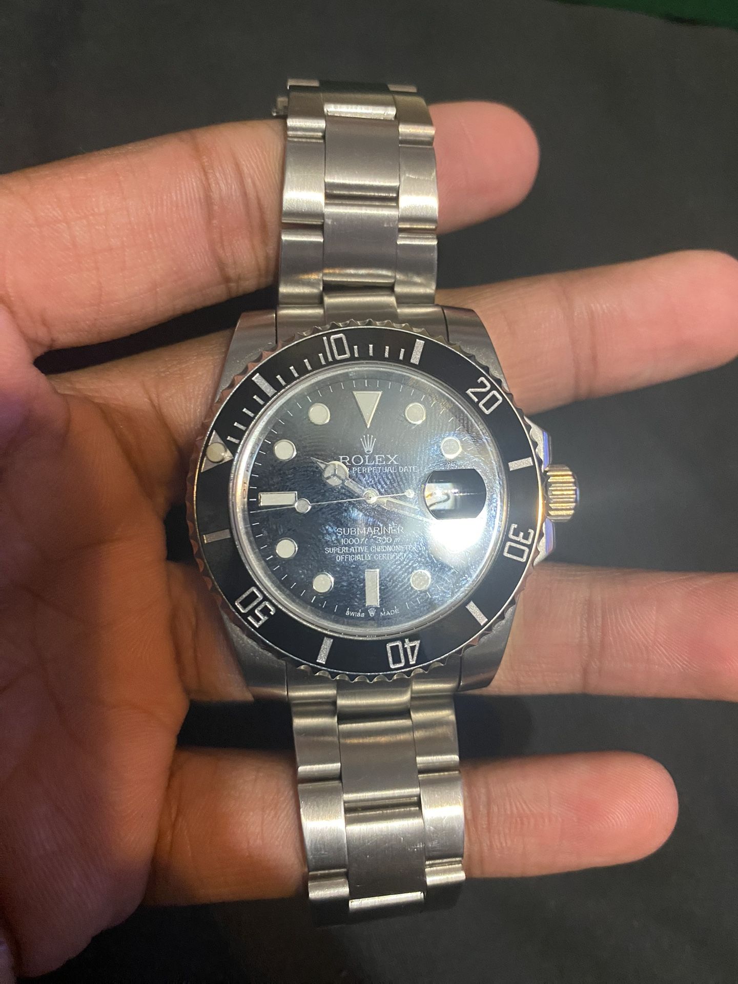 The watch includes the signature Cyclops magnifier over the date window and luminous hour markers for legibility in any lighting condition. Powered by Rolex’s self-winding Perpetual movement, it offers exceptional accuracy and durability, water-resistant up to 300 meters / 1000 feet. This Submariner represents the pinnacle of versatility — equally at home on the wrist during a dive or paired with formal attire. Details: • Brand: Rolex • Model: Submariner Date • Reference: (Insert reference number, e.g., 116610LN or 16610) • Case Material: Stainless Steel • Bracelet: Oystersteel with folding clasp • Bezel: Black unidirectional rotating bezel • Dial: Black with luminous markers • Movement: Automatic (Rolex Caliber 3135 or 3235) • Water Resistance: 300m / 1000ft • Crystal: Sapphire with Cyclops lens • Condition: (Insert your condition — e.g., Excellent / Lightly Worn) • Includes: (Box, Papers, or Watch Only) tg