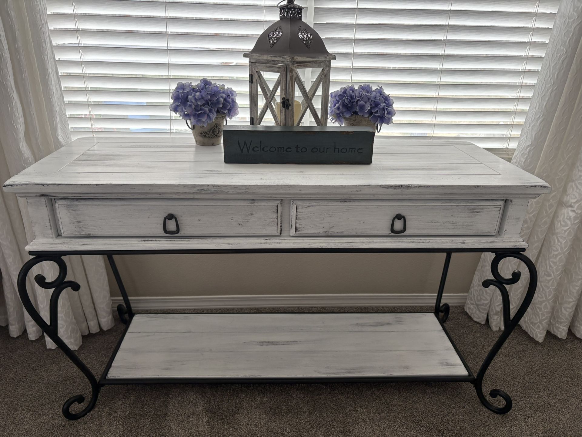 Solid wood hand painted n distressed for a shabby chic cottage look 27 3/4”H 4ft.L 18”D