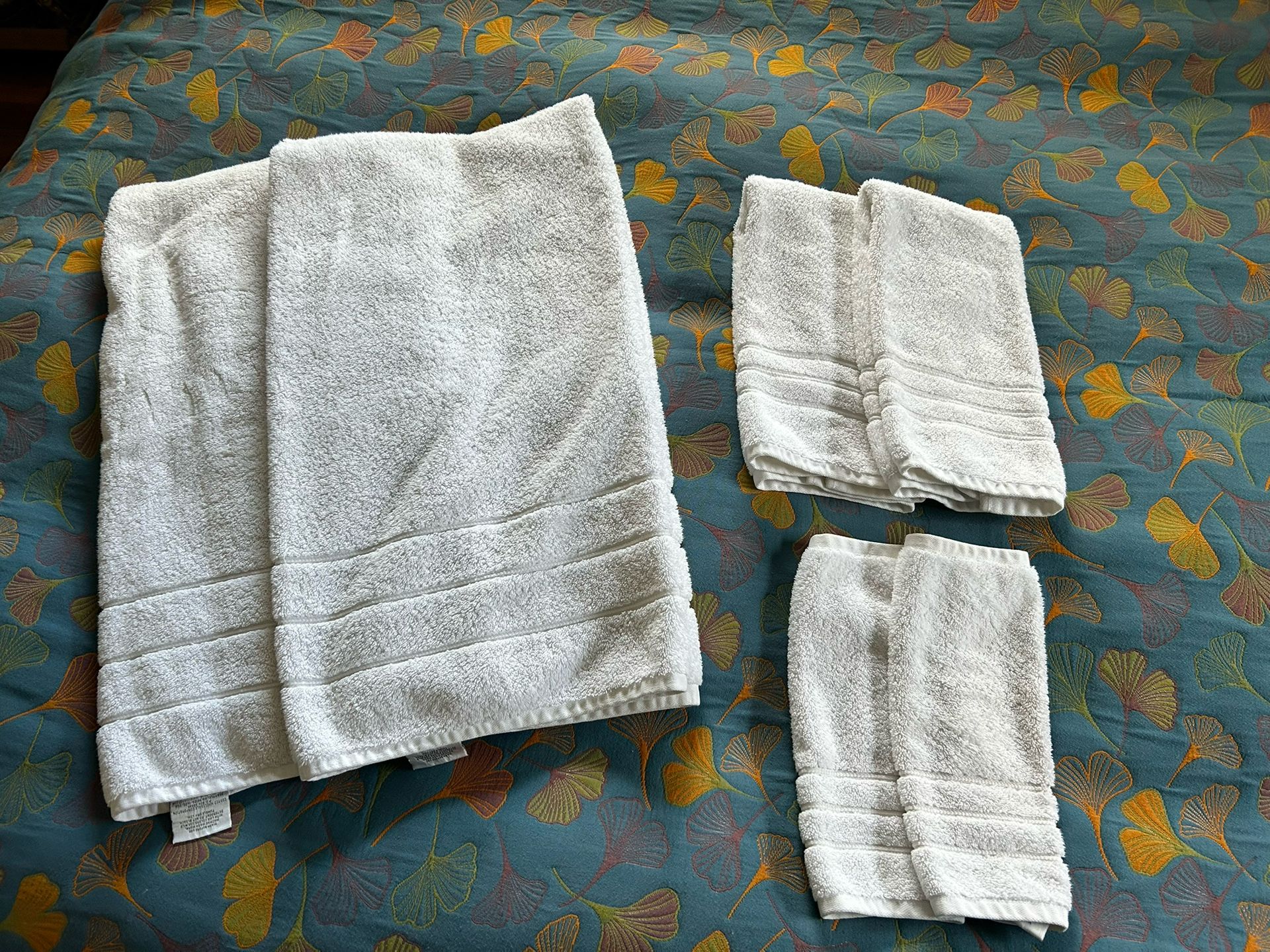Set of 2 bath & hand towels plus washcloths. Need extra for your holiday guests? These are great quality, soft, 100% cotton & no stains or snags. Used in Airbnb minimally. Selling in order to have all sets of towels match for quicker turnover moving forward.