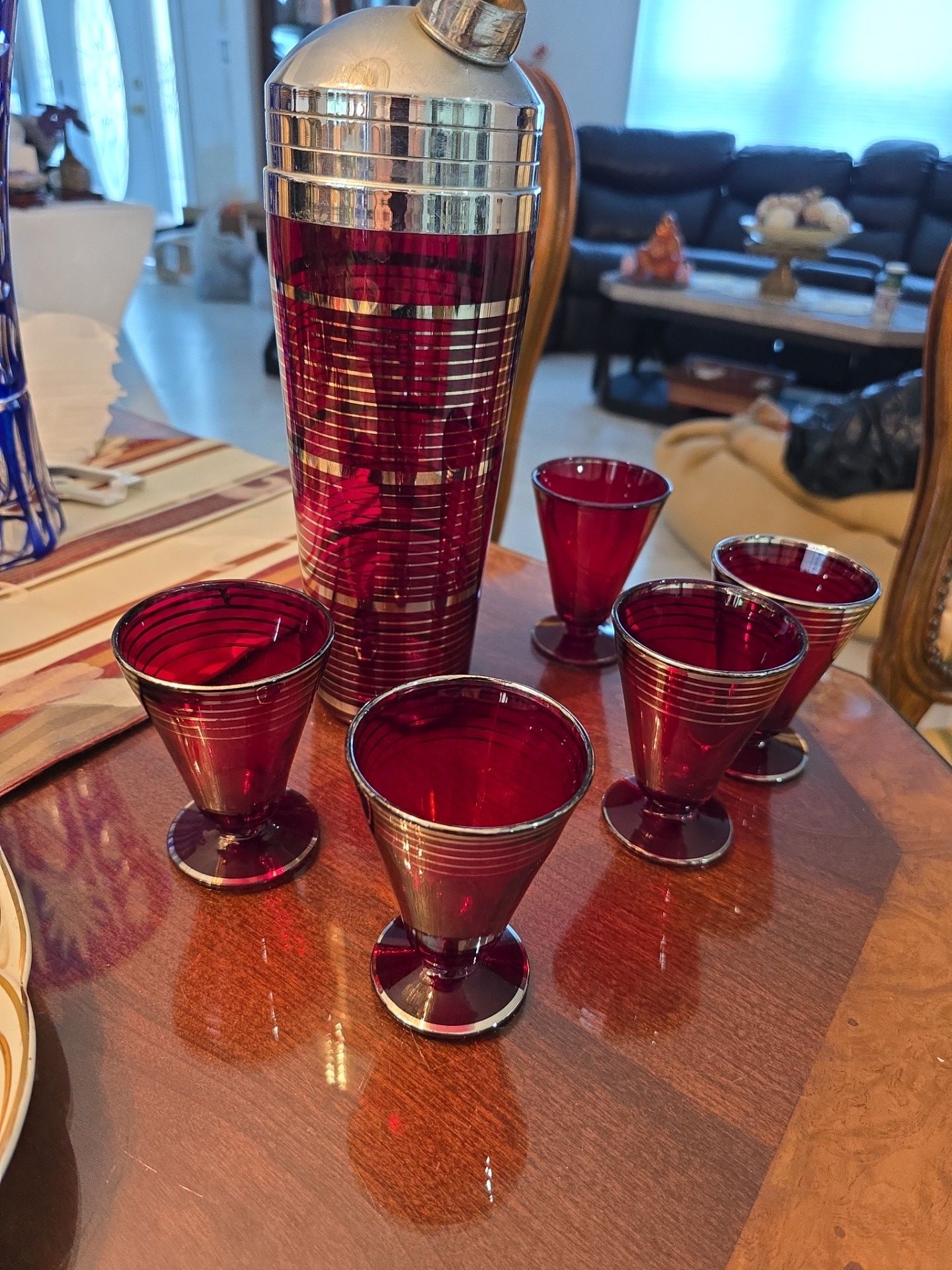 In good condition this Art Deco chrome Ruby Red cocktailbarware set from 1930 still not in perfect but good condition one off the glasses missing the silver lines but no cracks, no chips I don't received lower offers