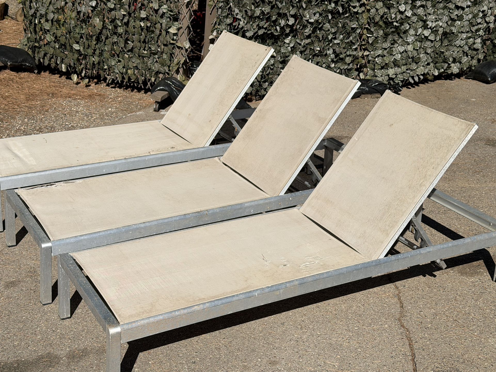 Selling a set of three aluminum patio chaise loungers. These have sturdy, rust-resistant metal frames and adjustable backrests. The sling mesh fabric is worn/torn and will need replacing — great project for DIY or a quick upgrade. Details: • Set of 3 matching loungers • Lightweight aluminum frames • Adjustable recline • Ideal for poolside, backyard, patio, deck, garden • Works with replacement sling fabric / mesh kits • Also compatible with outdoor lounge cushions Condition: Frames are solid. Fabric is worn/torn (see photos). Keywords: Patio furniture, outdoor furniture, pool furniture, sun loungers, chaise lounge chair, aluminum chaise, mesh lounge chair, patio set, outdoor seating, poolside loungers, garden furniture, resort furniture, commercial patio chairs, deck chaise, sling lounge replacement, modern outdoor furniture, lawn furniture, DIY patio project