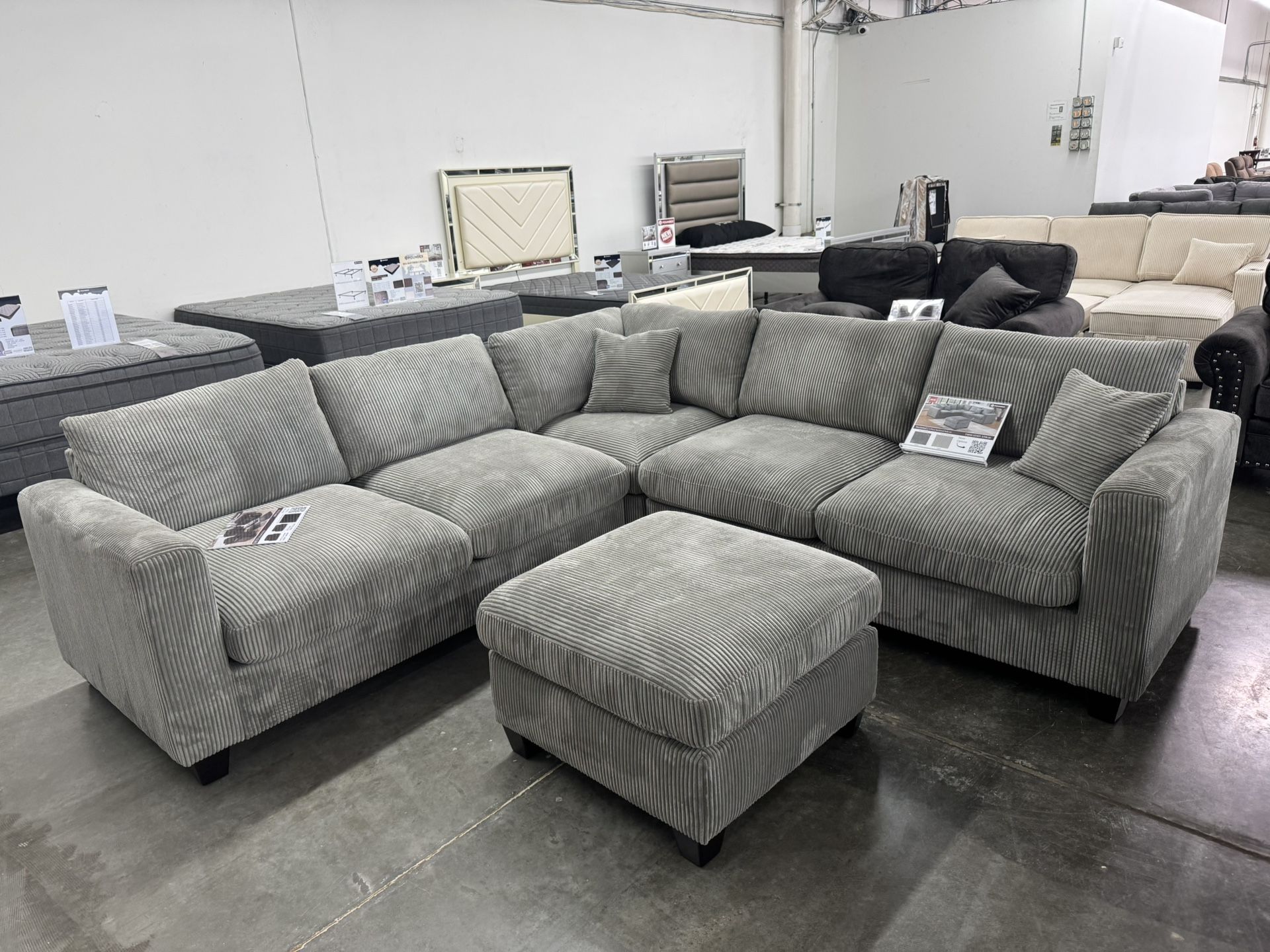 GREY COMFORTABLE CORDUROY MODULAR SECTIONAL WITH OTTOMAN