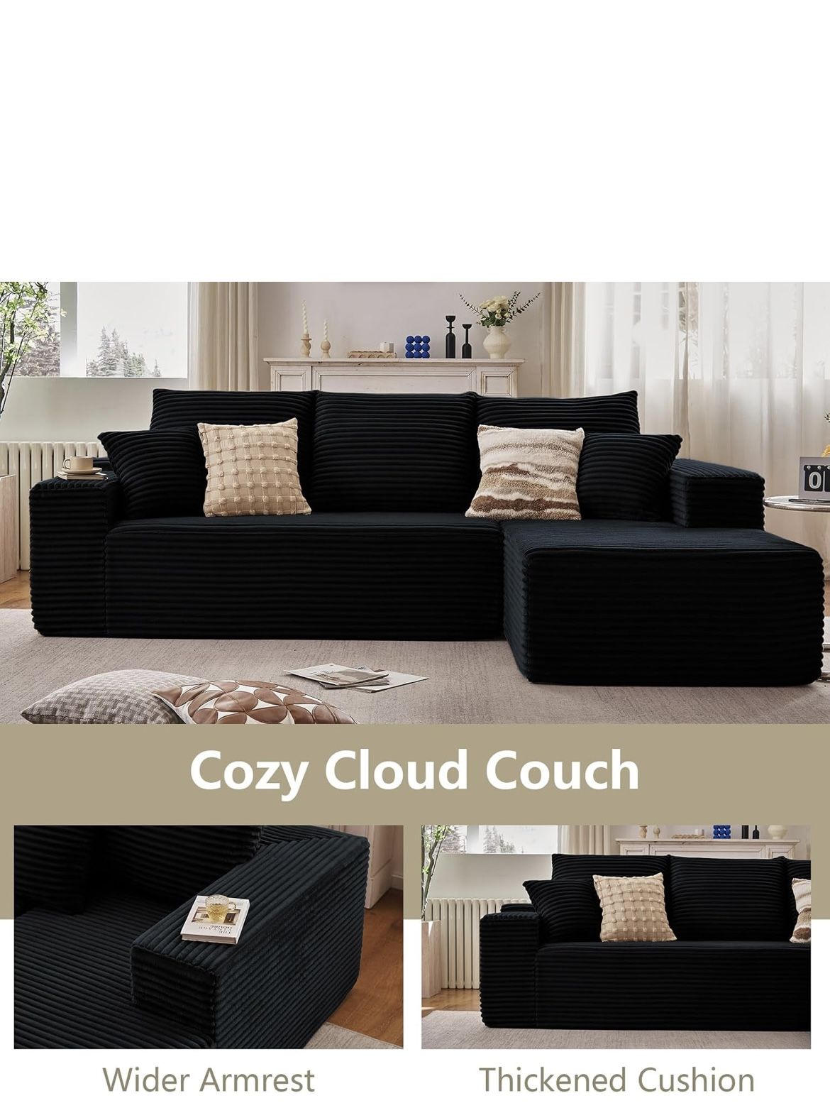107" Modular Sectional Couches for Living Room, Comfy Boneless L Shaped Cloud Couch with Chaise Lounge, Modern Cozy Corduroy Deep Seat Floor Sofa, Memory Foam, No Assembly Required, Black. Never opened or used! Can drop off