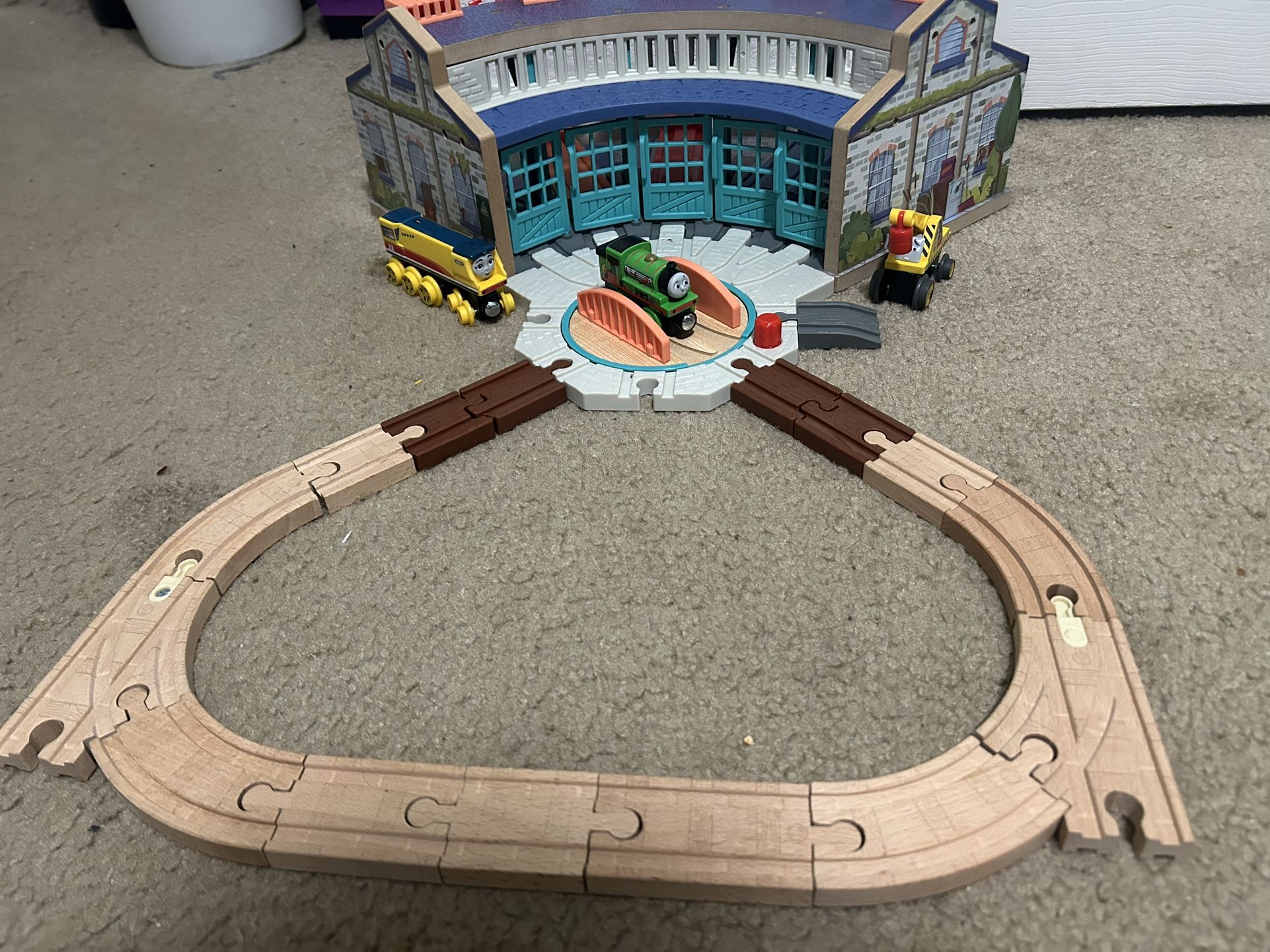 Thomas the tank engine and friends wooden railway train set. Thomas Wooden Railway Tidmouth Sheds Round House set . Almost complete only missing a few pieces but all major parts are here. Percy, Kevin and Rebecca are included. Rebecca is missing her tender