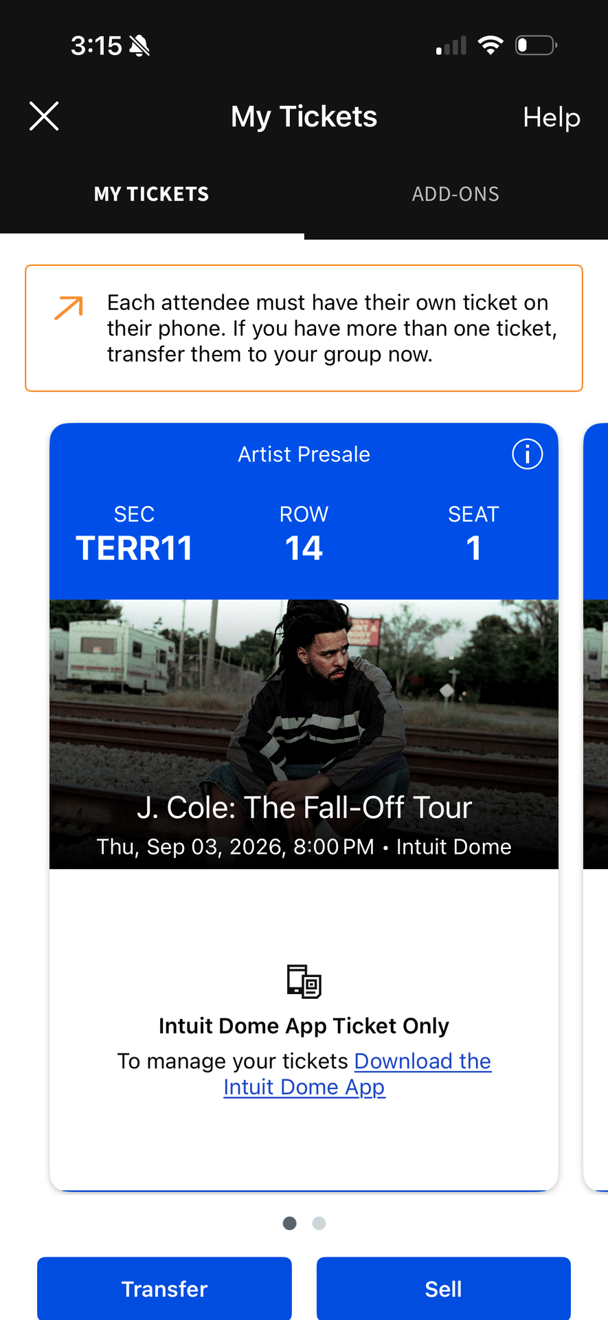 2 tickets for The Fall-Off Tour at the Intuit dome. Tickets are for 9/3/26 show Section Terrace 11 Row 14 Seat 1 & 2 Can meet up for transfer of ticket.
