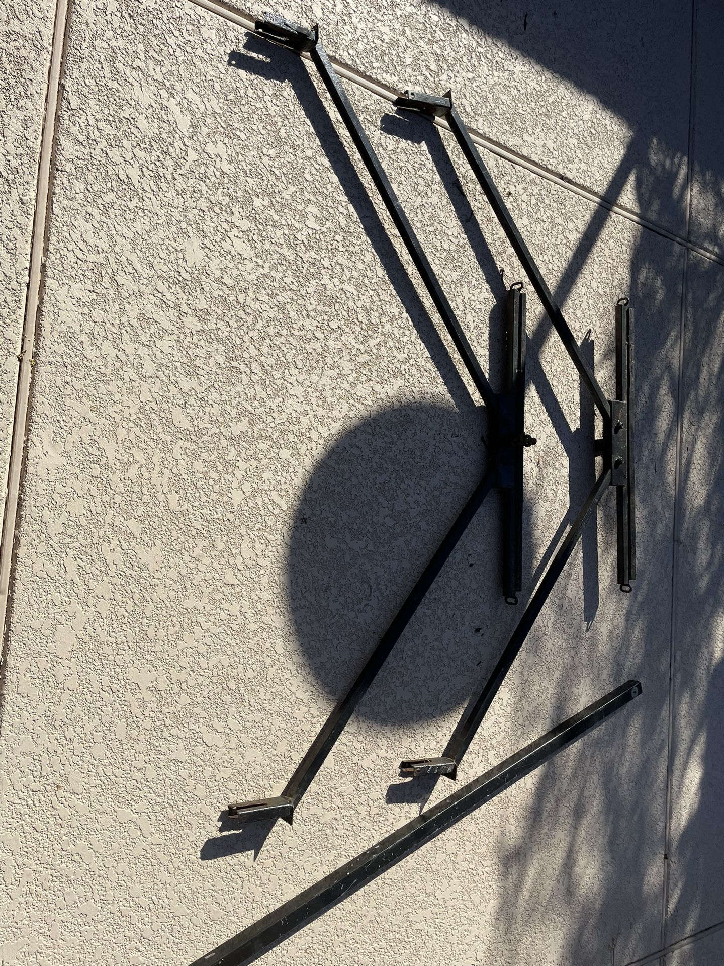 Center load canoe or kayak holder with stabilizer bar. Fits most pickups, custom made of steel with wood support overlay to protect load.