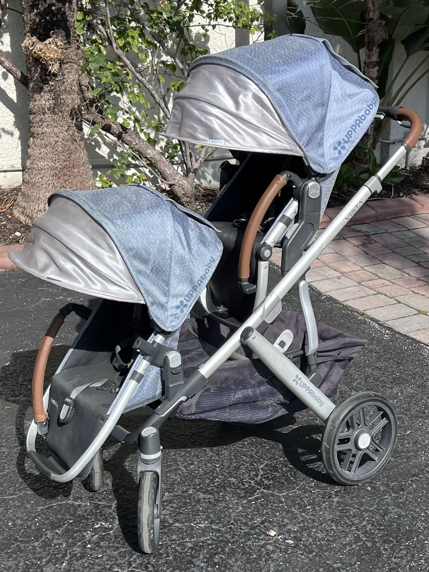With more than a dozen configurations, the versatile UPPAbaby Vista transforms into any stroller you need it to be, whether you're strolling with a single child, siblings or twins. It comes with a barely used bassinet that conveniently connects onto the base. All adaptors included.