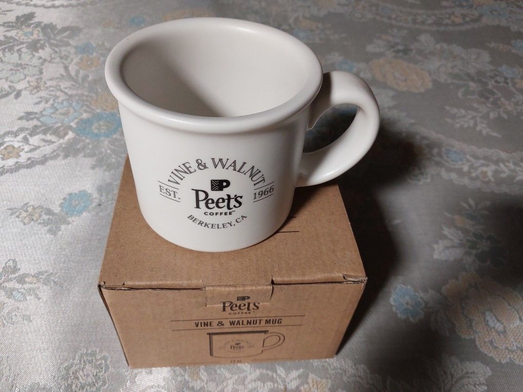 Two new, never used Peet's Vine & Walnut mugs from Berkley, CA. These 12 ounce mugs have a beautiful matte white finish, are dishwasher and microwave safe. $30 each or $50 for the pair.