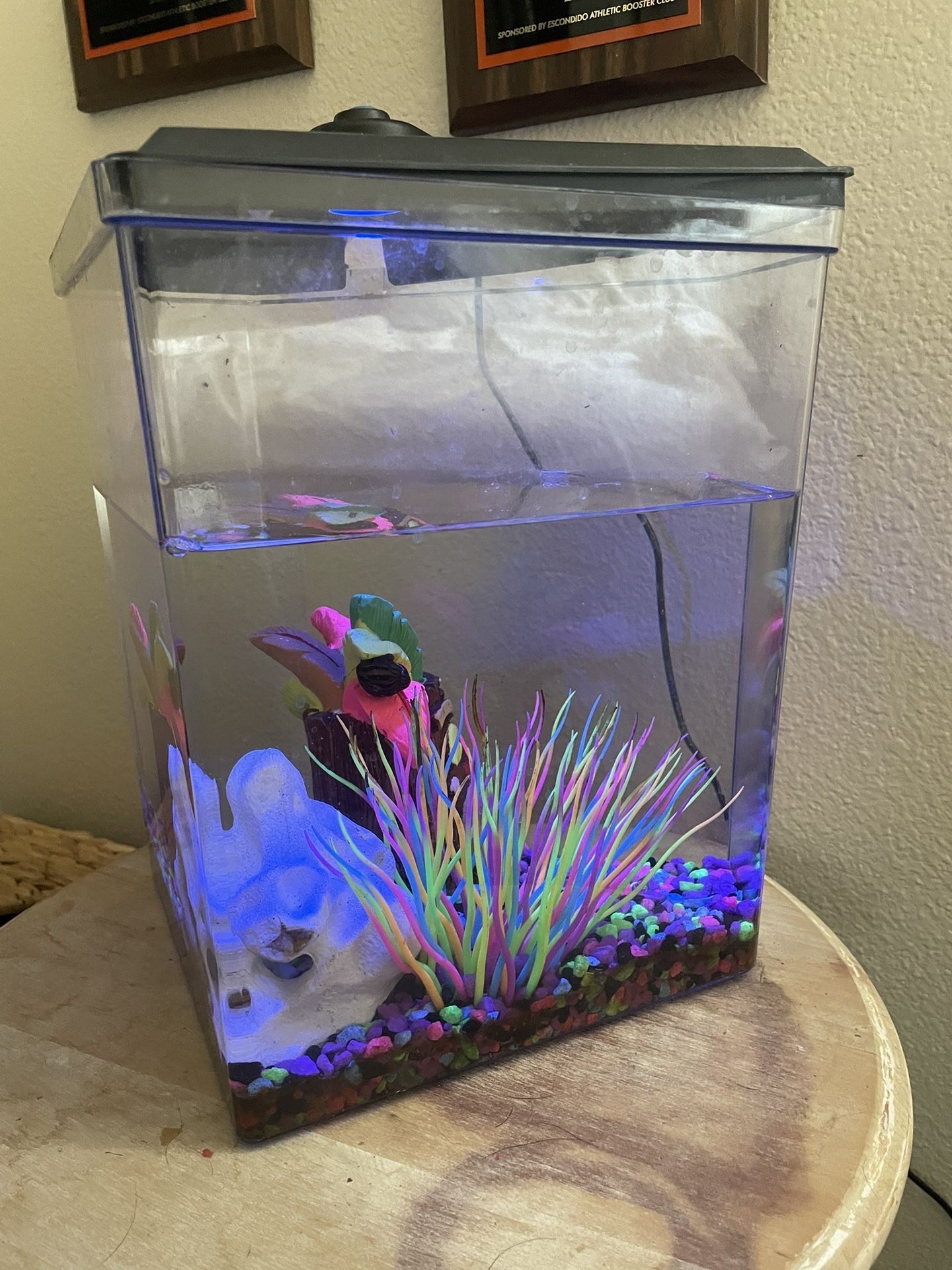 1 Gallon Fish tank, with light and filter. Comes with plastic rock, tiki and plant.