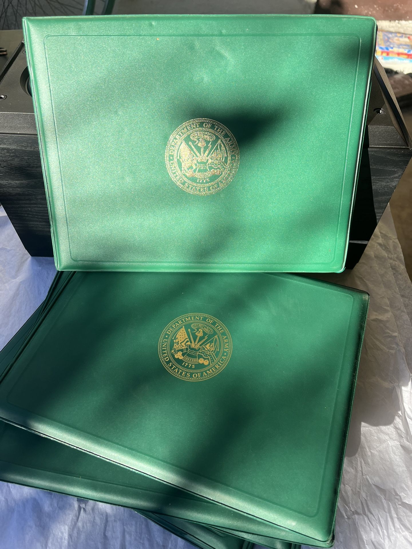 Original U.S. Department of the Army certificate award folders. Used for military awards, medals, honorable service certificates and memorial documents. Hard cover, gold embossed U.S. Army seal. Very clean condition. Perfect for: • Veterans • Military families • Collectors • Award ceremonies • Shadow box displays You will receive 7 folders total.