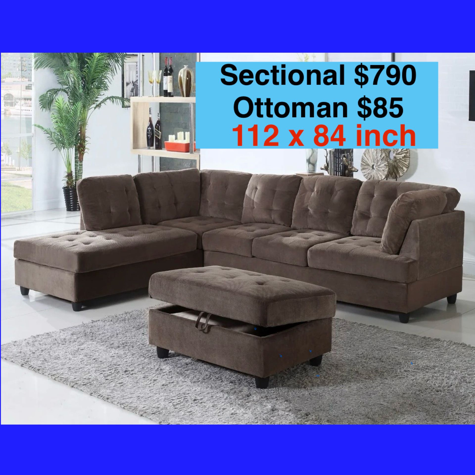 ♦️ ORDER TODAY – PAY AT YOUR DOOR! Serving Chicagoland, Rockford & Milwaukee Size: 112 x 84 inch long 🔥Buy Sectional( $790) + Ottoman ($85) TOTAL $875and get : ✔️ FREE DELIVERY 💵 Pay Cash or Zelle when delivered! 🛋️ EXCEL FURNITURE CHICAGO Your trusted local online furniture store since 2009