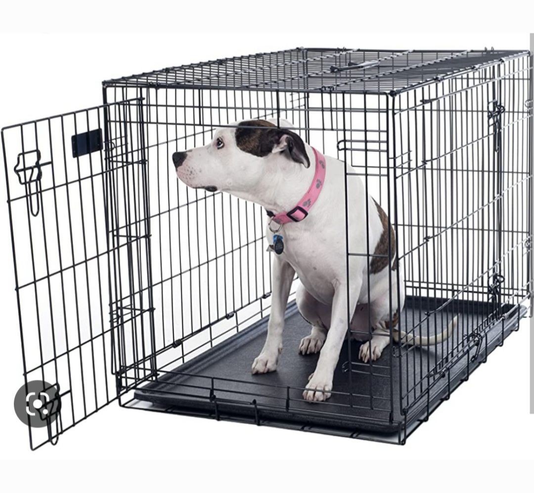 36” foldable dog crate with double doors and easy clean slide out bottom tray. Brand new in box