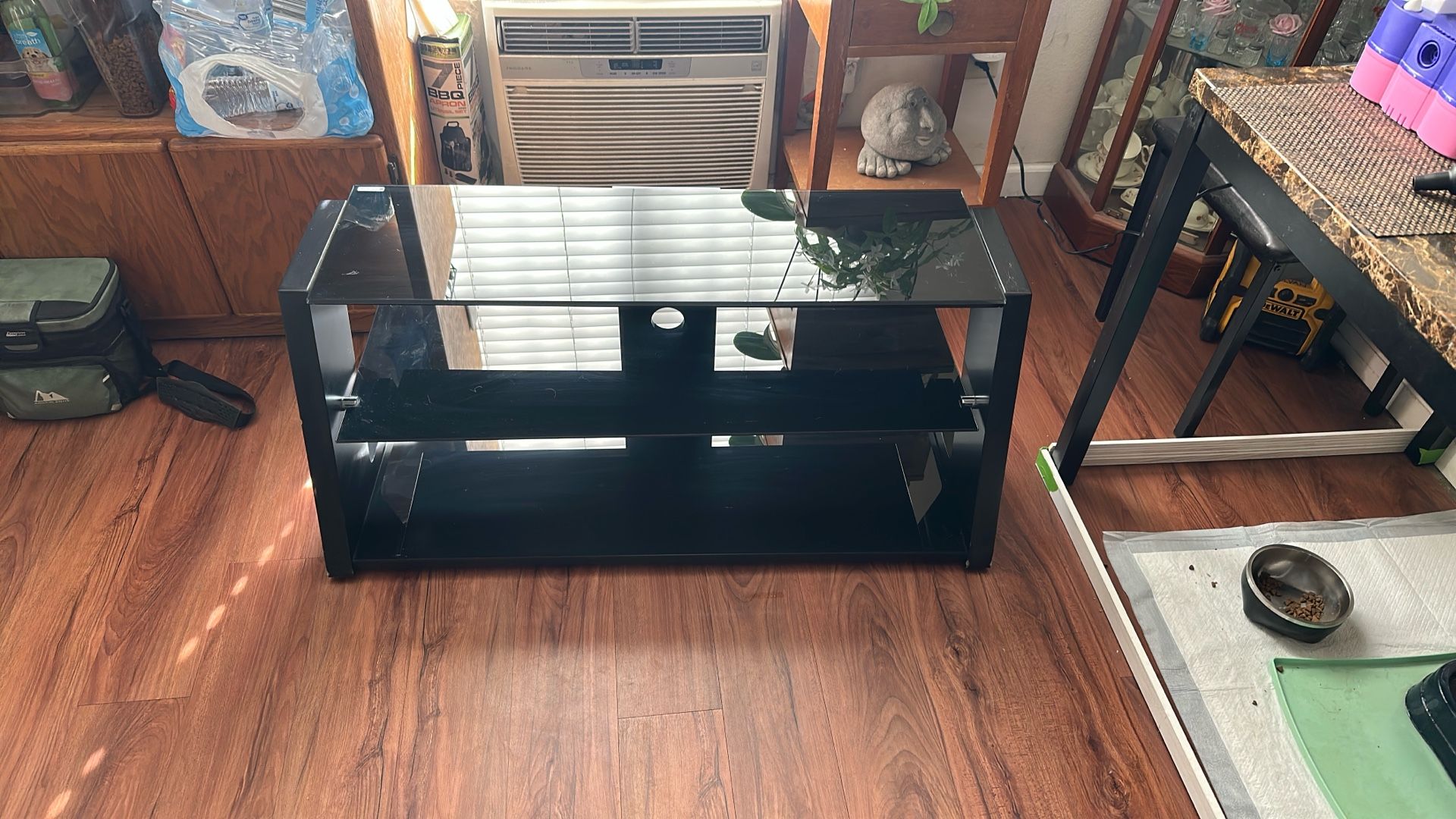 Price $50 of more offer Hold up to a flat panel television up to 46 in weighing 88lbs or less 3 layer shelves with like glass Backing has two holes for cords to go through