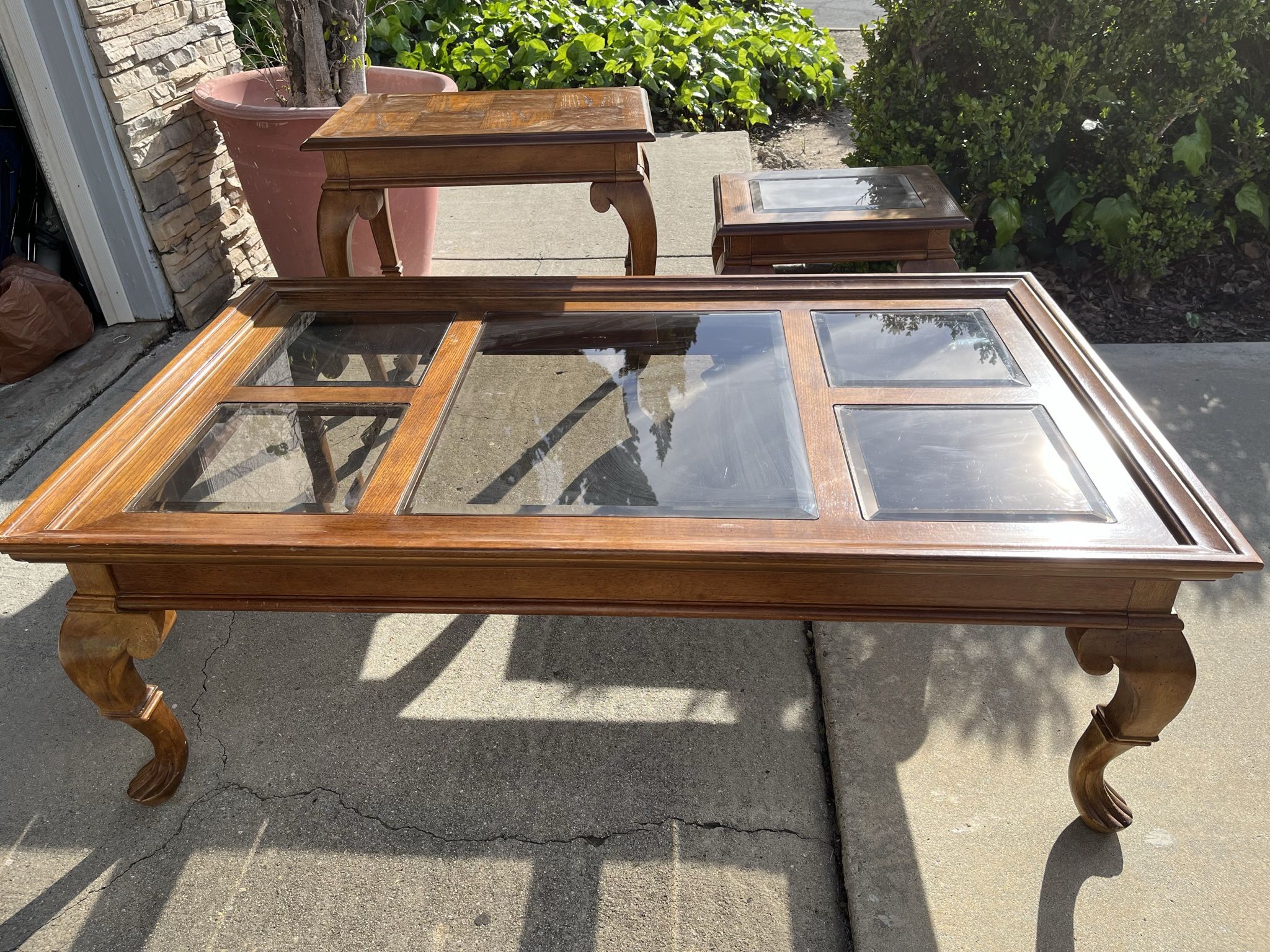 Set of 3 wood and glass coffee and end tables. Good quality!