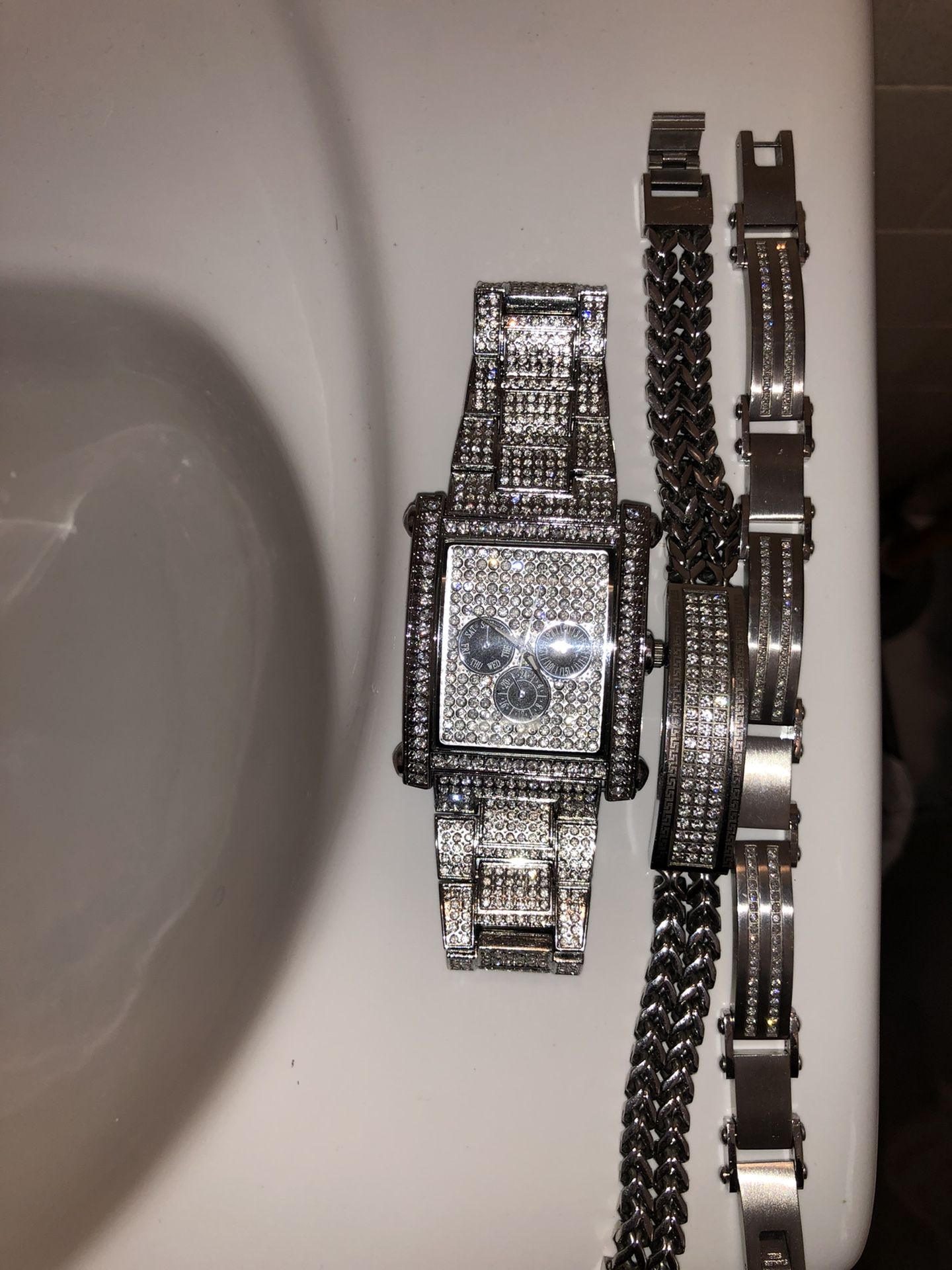 CZ Studded Watch, Bracelet With Studded Plate And Braided Band, Coupled Studded Bracelet