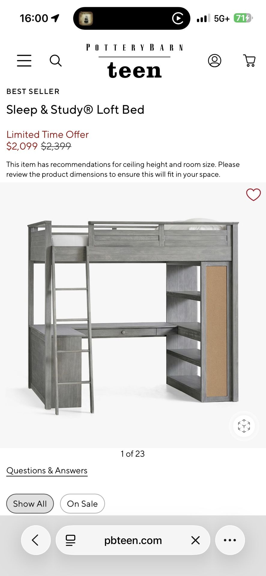Great space-saving loft bed with built-in desk and shelves! Perfect for a kid or teen room. β¨ Full-size loft bed πͺ΅ Solid, sturdy Pottery Barn quality π§βπ» Built-in desk + shelving underneath π¨ Neutral gray finish π Condition: Used β shows some normal signs of wear (cosmetic only) π§ Disassembled and ready for pickup π§© All pieces and hardware included See pictures for dimensions. Thanks!
