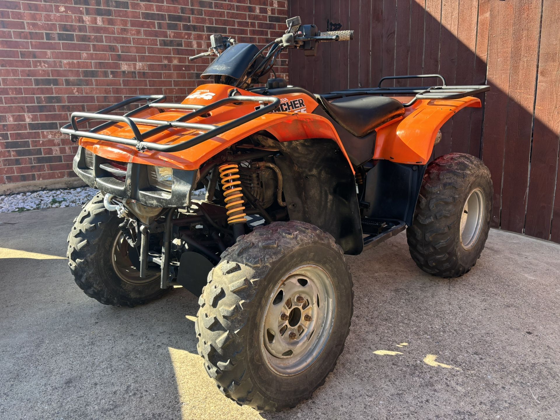 I have a 2002 Honda Rancher. I got it from a co-workers grandfather and it was missing many parts. I’ve spent hundreds and have a ton of new parts installed and wife says has to go. New parts include: Carb Taillight Fuel cockpit Handlebar gear controls Vacuum hoses Decals Igniter Battery Terminals Cluster cover Spark plug and wire Has aftermarket piston (bore scoped) Pro-circuit exhaust Wilwood front brakes This is a project so sold As-is haven’t been able to track down power to turn it over, but shouldn’t require much. Was told it ran before it sat. Cash, gold,silver or pew pew that’s all I’ll take