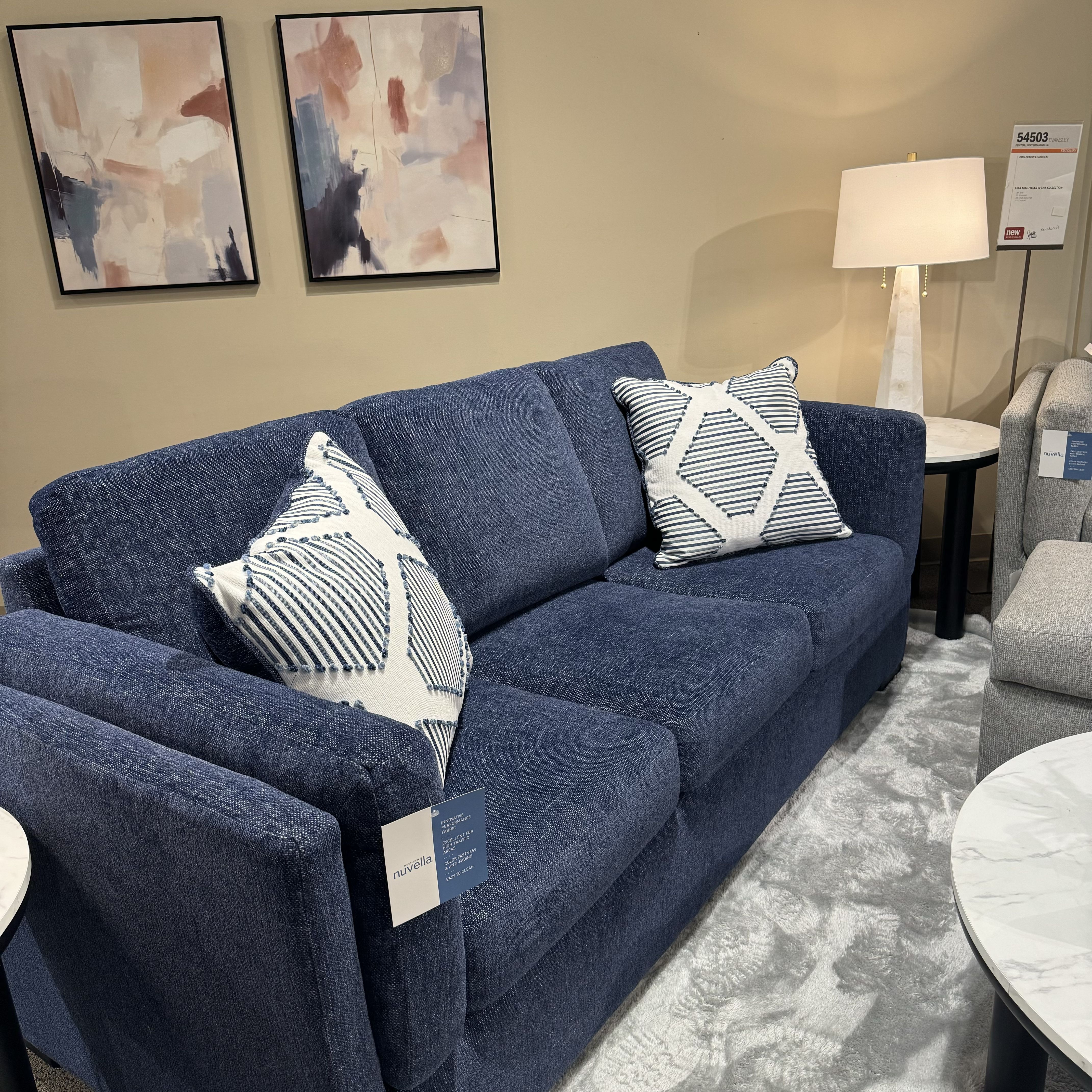 Sofa: 89"W x 38 "D x 39"H Reversible seat and back cushions Attached arm bolster pillows Next-Gen Nuvella is a solution-dyed performance fabric High UV resistance and durability for high-traffic areas Platform foundation system Wrinkle-free look Available as sofa, loveseat, chair and Ottoman in navy and gray. Come visit our showroom at 2235 N Tustin Ave. Santa Ana or 13000 Firestone Blvd. Santa Fe Springs or shop online at ornatehome.com Enjoy unlimited item delivery for only $99 Explore our wide range of furniture options, including dining room sets, bedroom furniture, sectionals, sofas, recliners, sleeper sofas, rugs, wall art, mattresses, bedding, kids' room furniture, office furniture, vanities, bookcases, and much more. We proudly carry brands such as Ashley Furniture, Tempur-Pedic, Sealy, and Stearns & Foster.