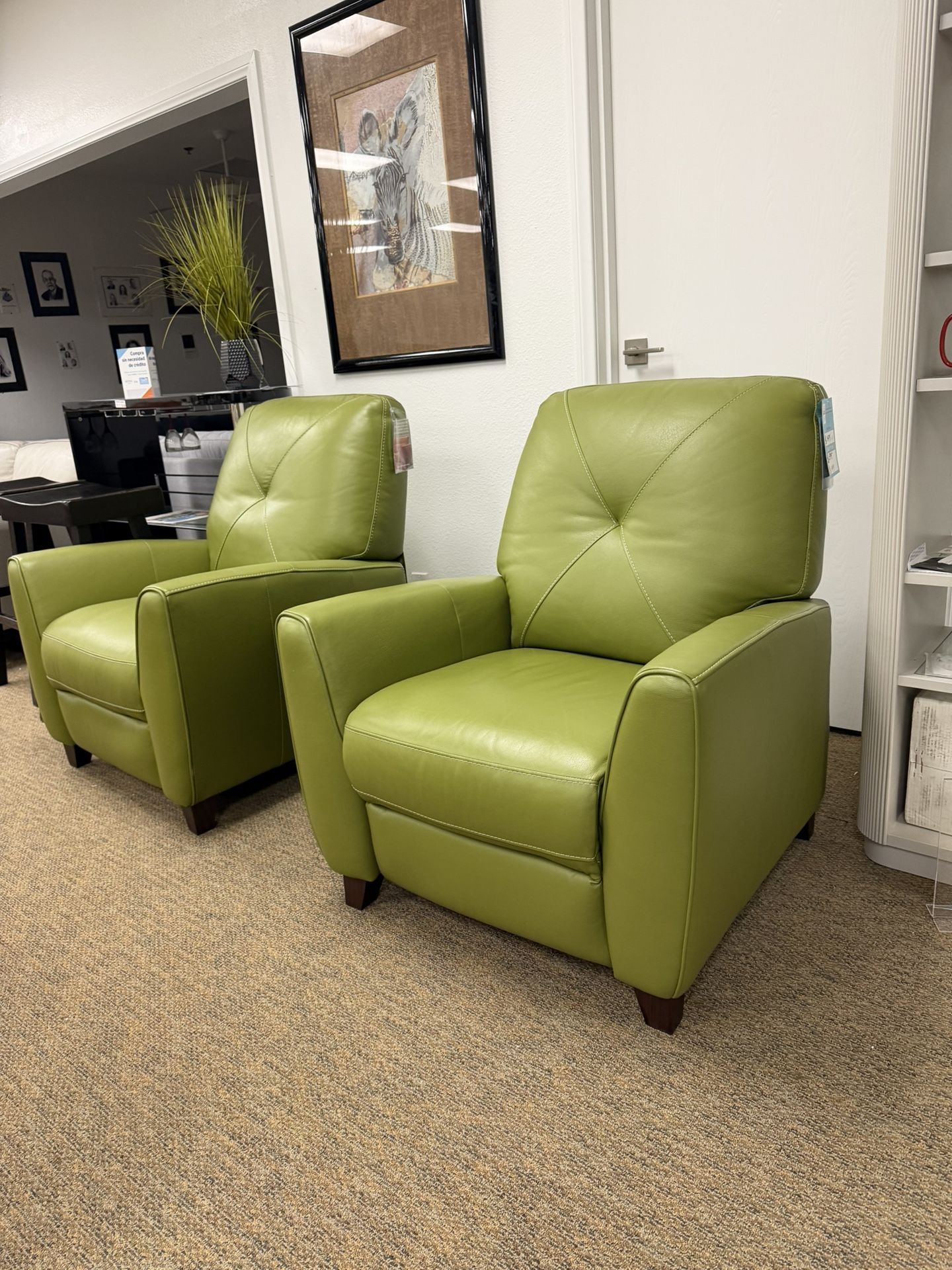 Price: $499 each recliner Approx dimensions: 35"W x 36"D x 35"H Store display/open item Furniture store location: 68945 Perez Rd Suite 1 Cathedral City 92234 JS Furniture and mattresses Store Hours: 10:00am to 5:00pm Open Wednesdayto Sunday Financing available-No credit needed Delivery is available Store number is 7605348222
