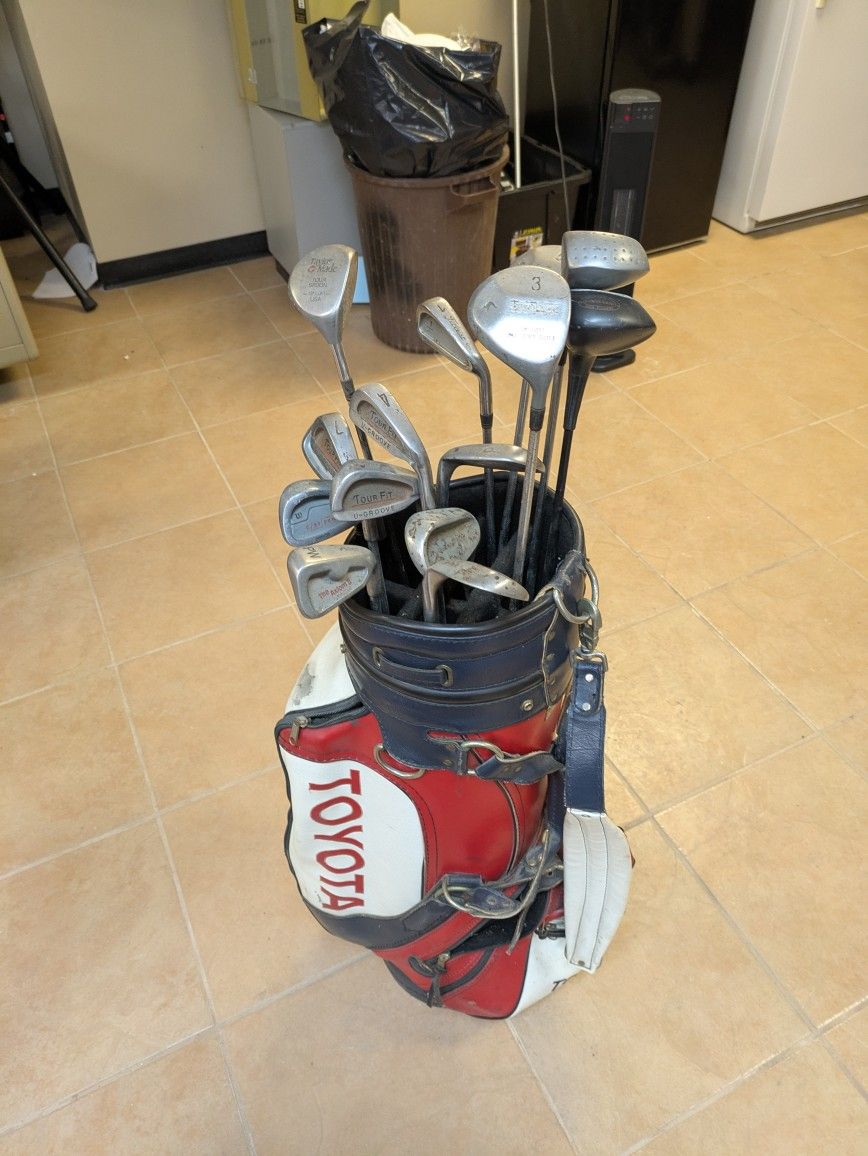 Assorted clubs and bag Clubs are available as a lot or individually. Most have dry rot on the grips and will need new grips or grip tape applied. $5 a piece $30 for the lot