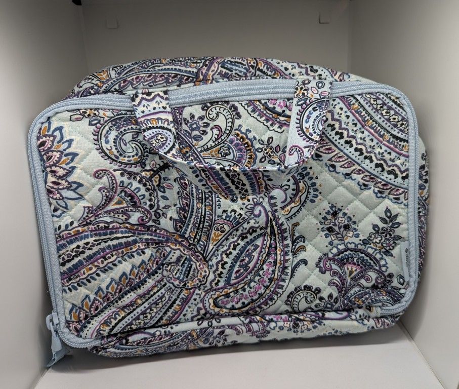 Beautiful travel case features three compartments, eight brush holders, and pockets galore. Made from a colorful and lightweight recycled cotton in color way Soft Sky Paisley. Front zip compartment features a mesh zip pocket with logo lining and a laminate wall with a PVC flap and eight elastic brush loops. Main zip compartment is PVC lined and features three elastic loops. Back zip compartment features logo lining with three gusseted elastic pockets, a zip pocket, and a slip pocket. Zip closures. Measures 10.5" W x 7.0" H x 5.5" D with a 3.0" strap drop. Reasonable offers considered.