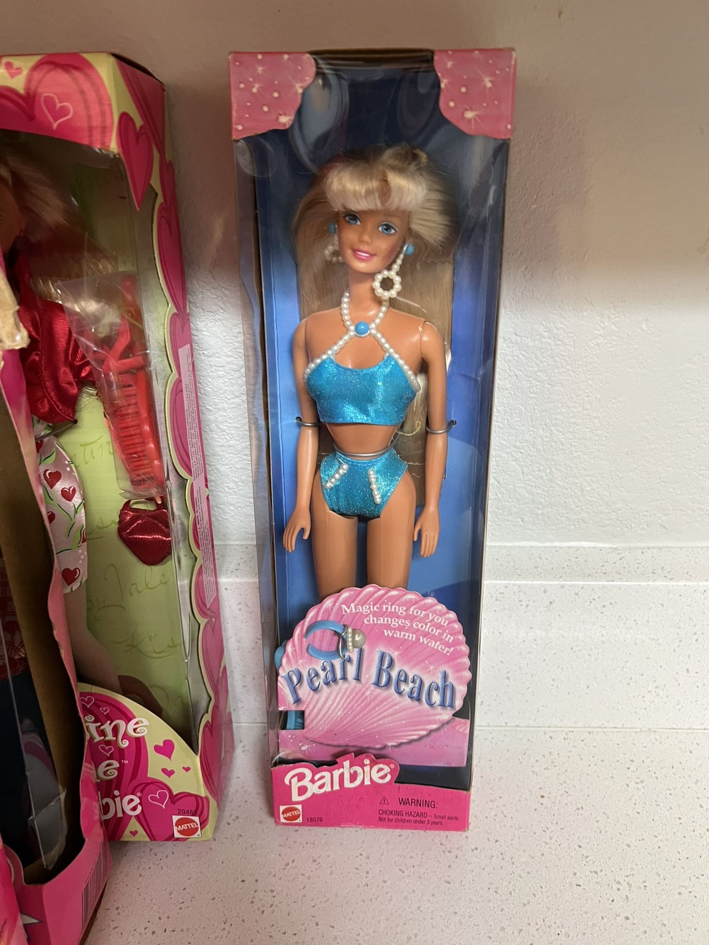 1997 Pearl Beach Barbie doll by Mattel, stock number 18576. The doll wears a blue glittery bikini with white pearl accents. It includes a human-sized "magic ring" that changes color in warm water. The doll has blonde hair with a white stripe and blue eyes. $20