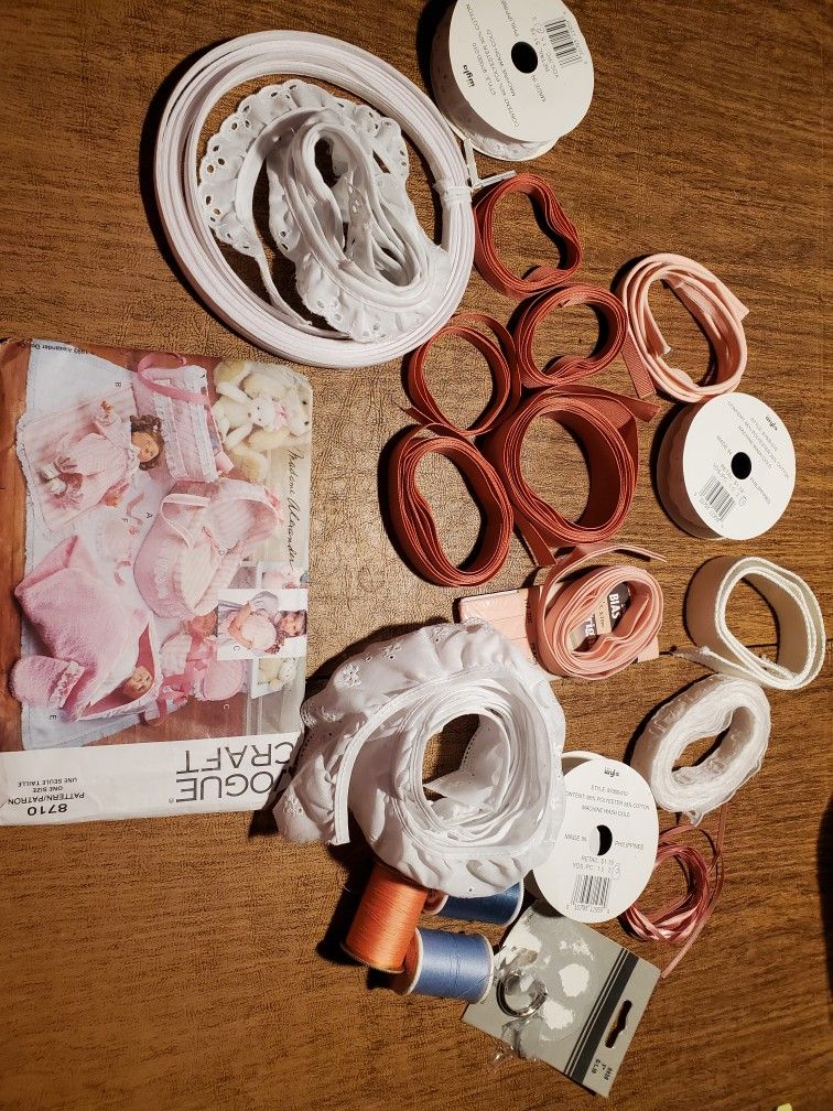 Madame Alexander pattern for doll accessories: bassinet, diaper bag, doll carrier, pillow, blanket, hooded towel, wash mitt and bib. Offering includes pattern, fabric and notions. For most of the items, pattern pieces have already been cut out. Where they have not, there is sufficient fabric to make them. Notions are included, including trim and thread. A couple of notions are missing and will be noted. An inventory will be included.