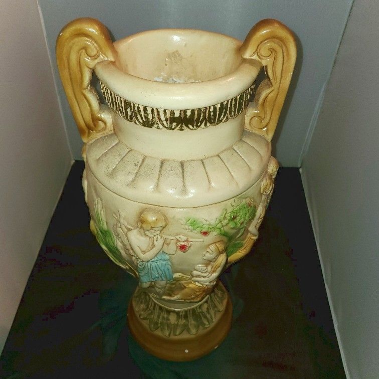 VINTAGE Greek Ceramic Urn Vase With Large Deep Carved Figures and Fine Detail Carving. Dimensions: 22" Tall.