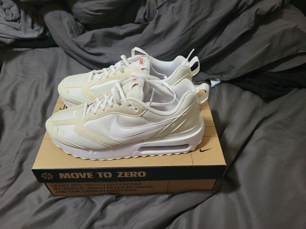The color is off white...box says white and coconut. Definitely threw me off when they arrived. Thought they were all white. Brand new never been worn. There is a very small brownish colored dot on the top of the left shoe. Shoes came like that. I have not tried it remove it.