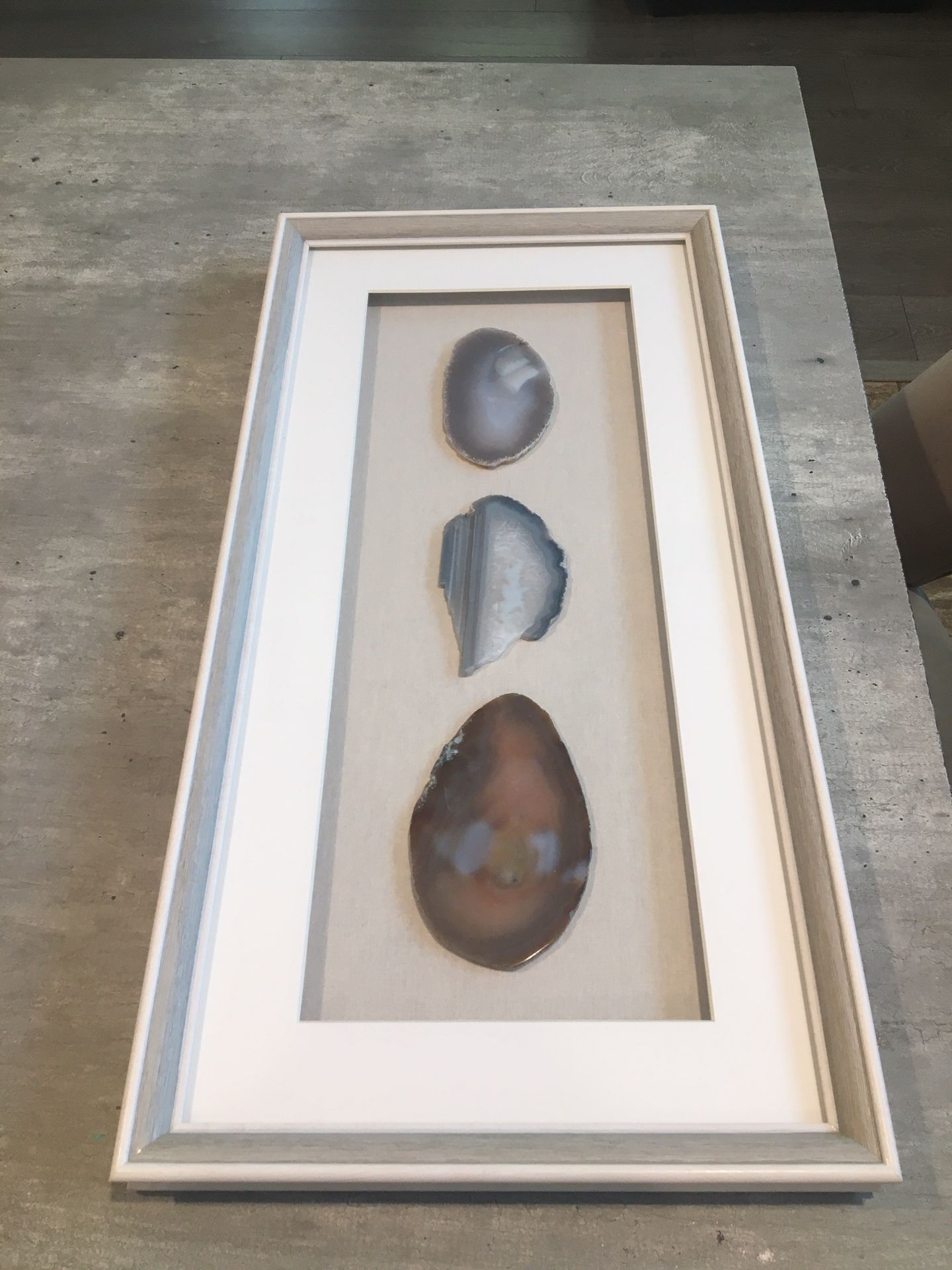 Beautiful white wash frame, three types of rock inside. 2 ft x 1 ft