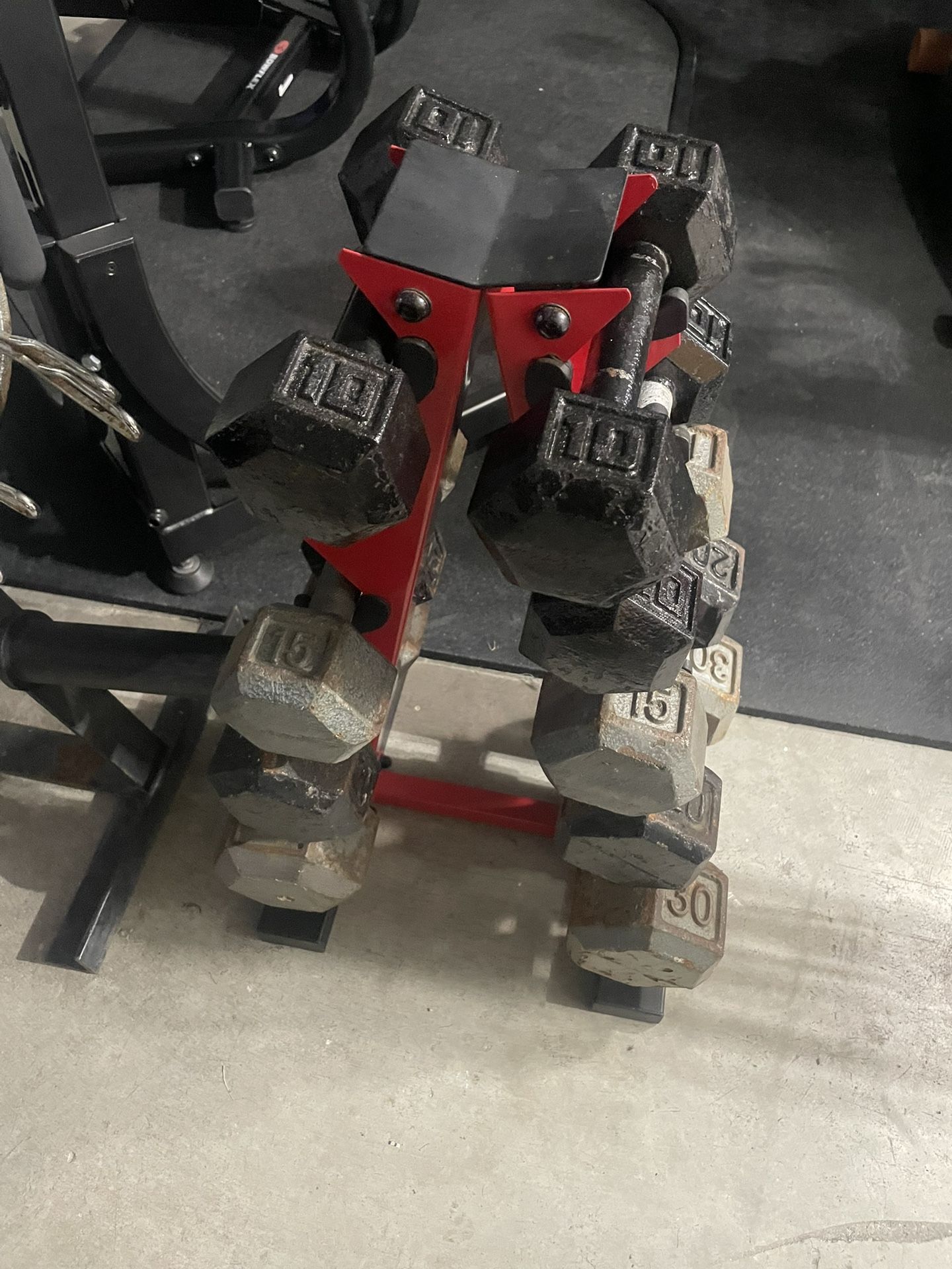 Cast Iron Dumbbell Weight Set Surface rust on some dumbbells, please see pictures for condition Included: (1) CAP Dumbbell Rack (3) 10lb Dumbbells (2) 15lb Dumbbells (2) 20lb Dumbbells (2) 30lb Dumbbells Not willing to sell separately Pick up in Salinas