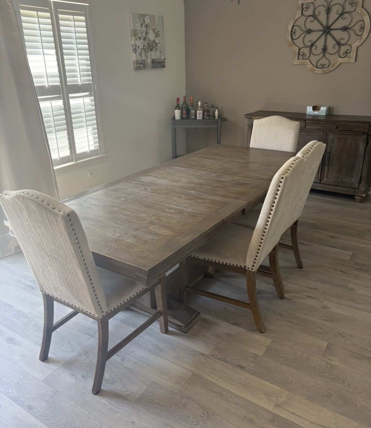 Full dining room set -large table WITH LEAF -4 chairs -1 large Bench - 1 buffet -1 BRAND NEW TABLE TOP STILL IN BOX WITH LEAF (delivered an additional by mistake)