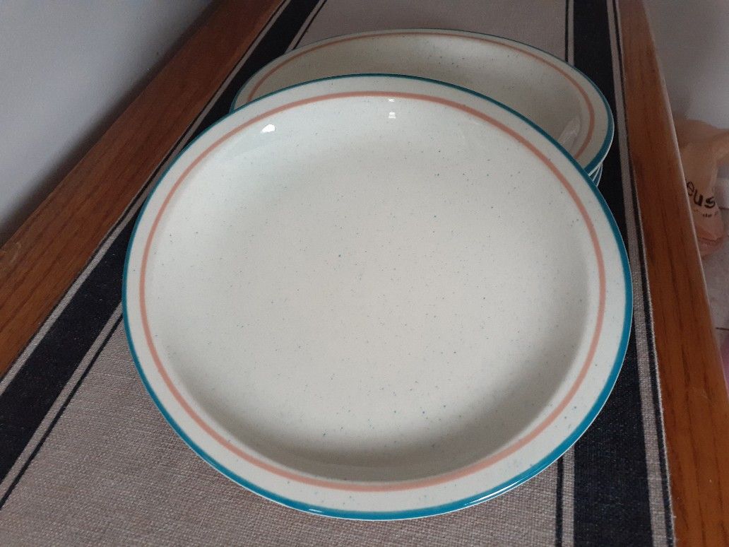 Syracuse China made in USA Retro oval shaped plates Thin blue and pink line around the rim Blue speckled pattern
