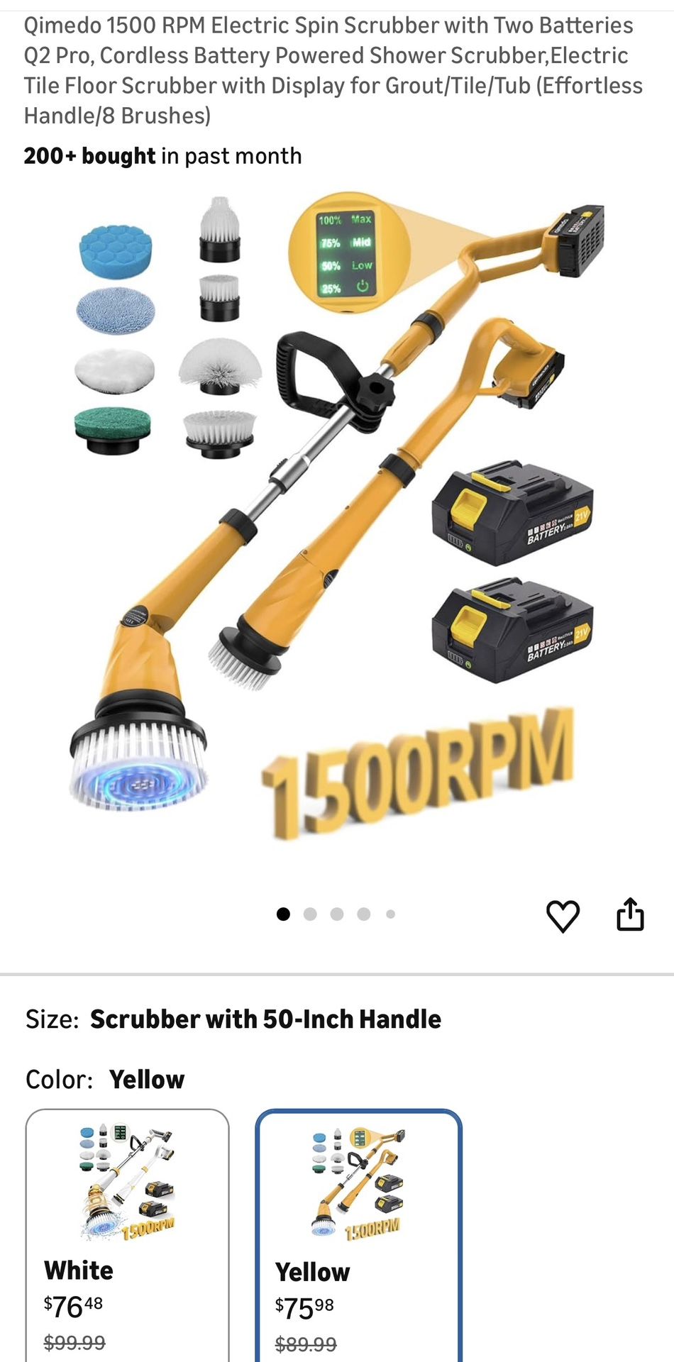 Qimedo 1500 RPM Electric Spin Scrubber with Two Batteries Q2 Pro, Cordless Battery Powered Shower Scrubber,Electric Tile Floor Scrubber with Display for Grout/Tile/Tub (Effortless Handle/8 Brushes)