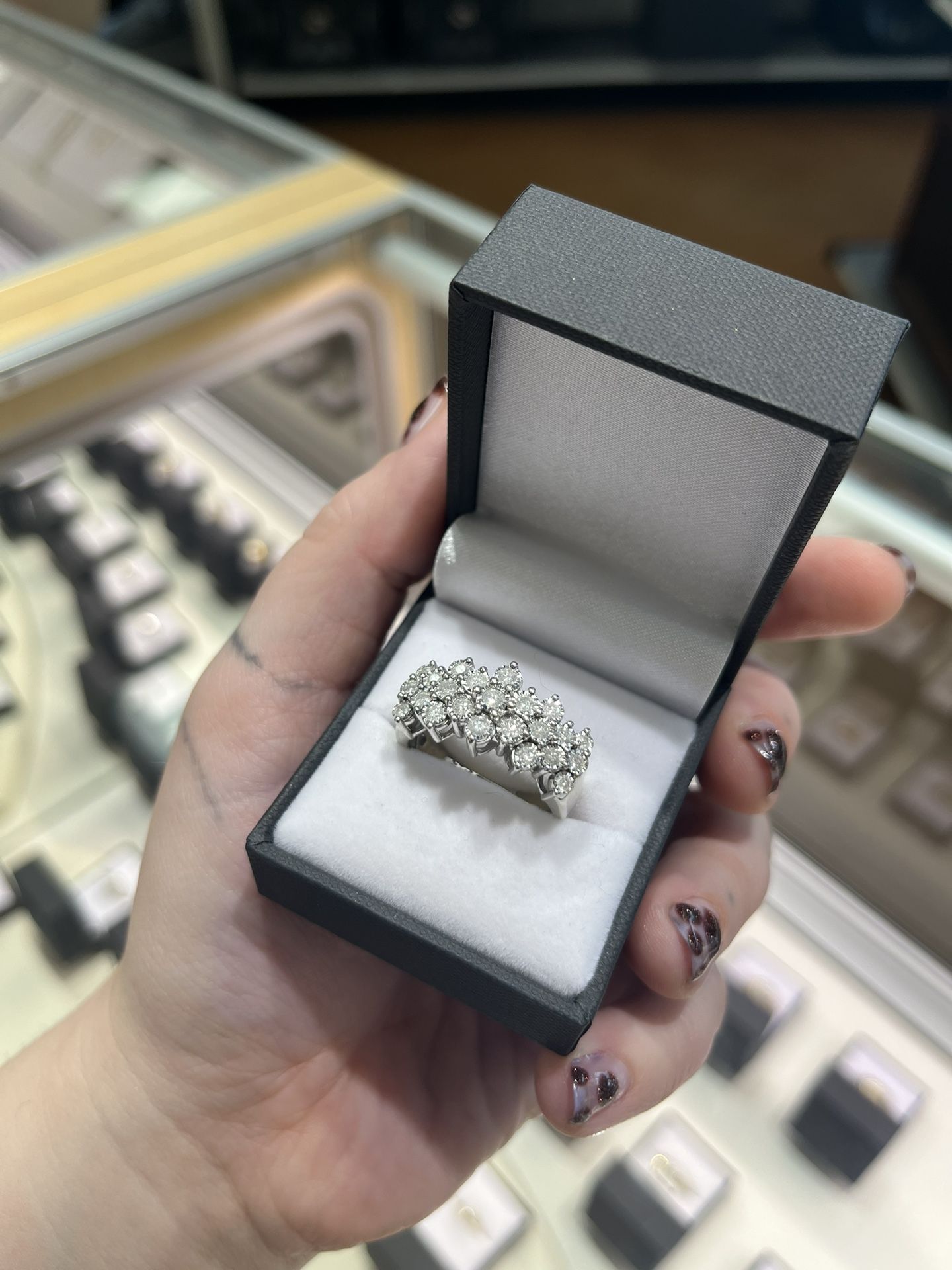 Gorgeous white gold cluster ring boasting over two and a half carats worth of diamonds! Gold is 10kt and solid Weight is 7.2 grams Diamonds are natural earth mined with a total Carat weight of 2.64 Gift box and bag available at no extra charge, just ask for Annedrew!
