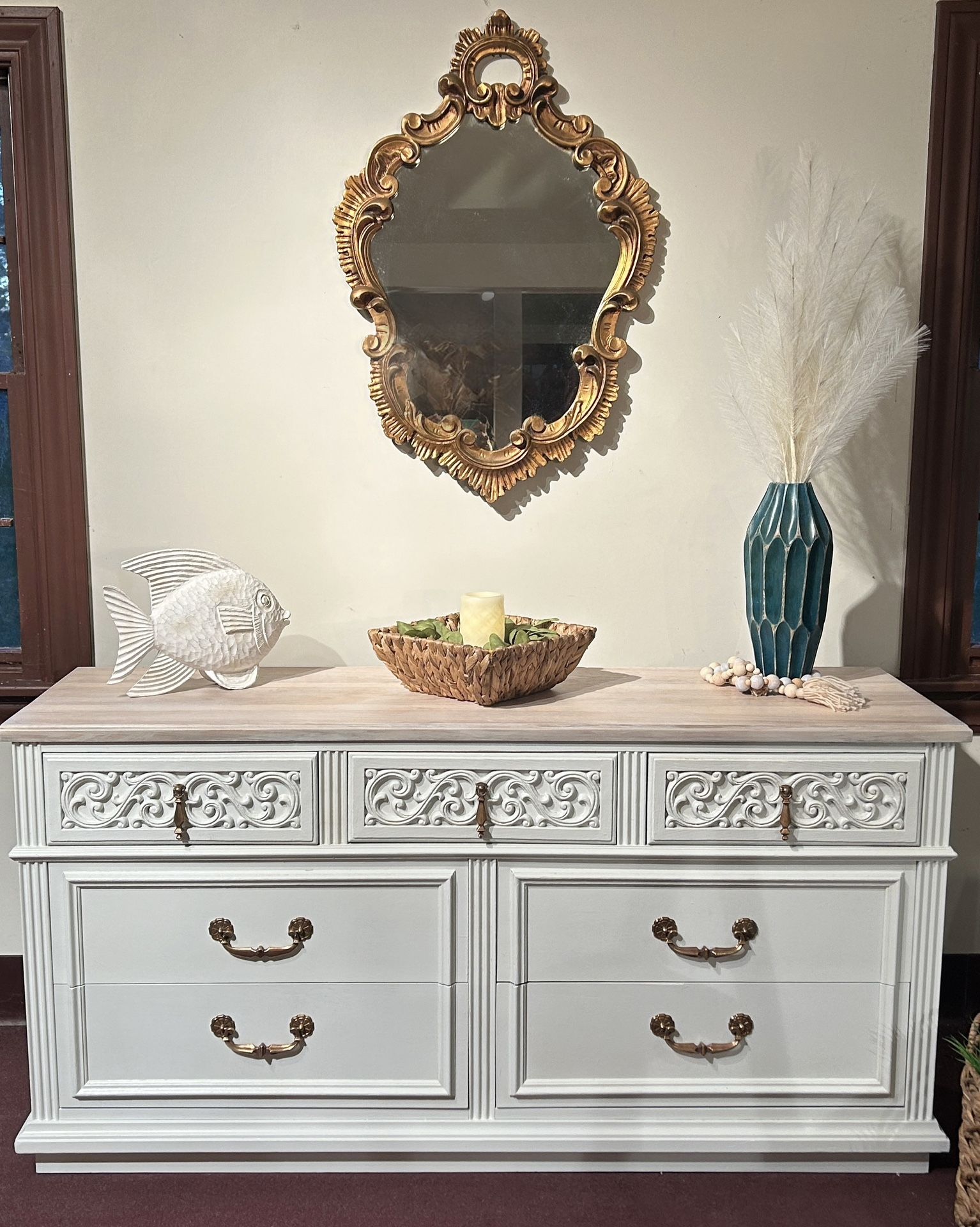 Solid wood cream dresser with whitewashed top. Scrolled drawer fronts. Brass drawer pulls and handles. Measures 31H x63Wx 20D