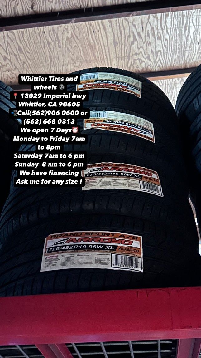 WHITTIER TIRES 13029 IMPERIAL HWY WHITTIER CA 90605 CALL (562)906-0600 TEXT (562)413-6926 - WE HAVE THE BIGGEST USED & NEW TIRE INVENTORY AVAILABLE, ASKS US FOR ANY SIZE YOU NEED. FINANCING OPTIONS AVAILABLE, 90 DAY NO INTEREST! HABLAMOS ESPAñOL. OPEN MONDAY-FRIDAY 7AM-8PM, SATURDAY 7AM-6PM, SUNDAY 8AM-5PM 185/65/14 175/65/15 185/55/15 185/65/15 195/65/15 205/55/16 215/55R16 215/60/16 205/65/16 245/75/16 265/70/16 285/75/16 265/75/16 215/45/17 225/45/17 225/50/17 215/50/17 215/55/17 235/65/17 245/65/17 255/65/17 265/70/17 285/70/17 33x12.50r17 215/45/18 225/40/18 235/40/18 235/45/18 245/45R18 235/60/18 245/60R18 265/60/18 255/70/18 265/70/18 33x12.50r18 225/40/19 235/40/19 245/40/19 245/45/19 245/35/20 245/45/20 245/50/20 255/50/20 265/50/20 275/55/20 275/60/20 33x12.50r20 35x12.50r20 37/13.50R20 265/35/22 285/45/22 305/40/22 305/45R22 33x12.50R22 295/35/34 305/35R24 ESPECIAL DE LLANTA NUEVA Y USADA GOODYEAR MICHELING BRIDGESTONE FIRESTONE CONTINENTAL ARROYO YOKOHAMA PIRELLI KUHMO TOYO ATLANDER LANDGOLDEN LANDSPIDER LLANTAS TIRES WHEELS