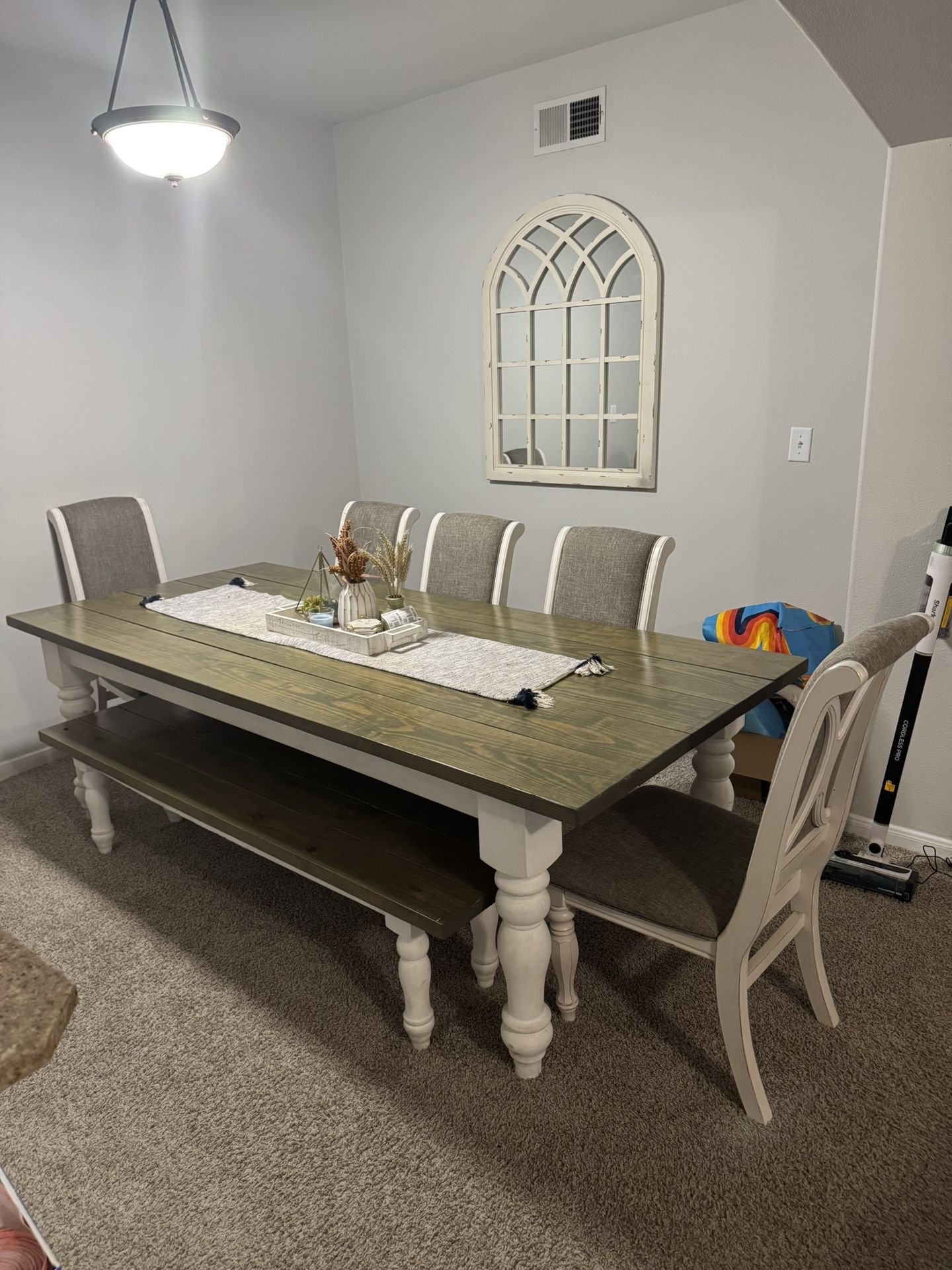 Custom solid wood 96 inches length 46 inches width French farmhouse, table and bench only for sale
